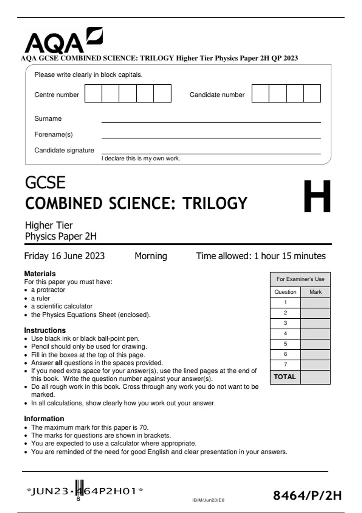 AQA GCSE COMBINED SCIENCE: TRILOGY Higher Tier Physics Paper 2H QP 2023