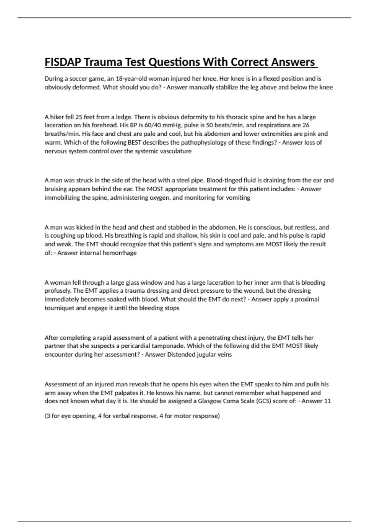 During a soccer game, an 18-year-old woman injured her knee. Her knee is in a flexed position and is obviously deformed. What should you do? - Answer manually stabilize the leg above and below the knee A hiker fell 25 feet from a ledge. There is obvious deformity to his thoracic spine and he has a large laceration on his forehead. His BP is 60/40 mmHg, pulse is 50 beats/min, and respirations are 26 breaths/min. His face and chest are pale and cool, but his abdomen and lower extremities are pink and warm. Which of the following BEST describes the pathophysiology of these findings? - Answer loss of nervous system control over the systemic vasculature A man was struck in the side of the head with a steel pipe. Blood-tinged fluid is draining from the ear and bruising appears behind the ear. The MOST appropriate treatment for this patient includes: - Answer immobilizing the spine, administering oxygen, and monitoring for vomiting A man was kicked in the head and chest and stabbed in the abdomen. He is conscious, but restless, and is coughing up blood. His breathing is rapid and shallow, his skin is cool and pale, and his pulse is rapid and weak. The EMT should recognize that this patient's signs and symptoms are MOST likely the result of: - Answer internal hemorrhage A woman fell through a large glass window and has a large laceration to her inner arm that is bleeding profusely. The EMT applies a trauma dressing and direct pressure to the wound, but the dressing immediately becomes soaked with blood. What should the EMT do next? - Answer apply a proximal tourniquet and engage it until the bleeding stops After completing a rapid assessment of a patient with a penetrating chest injury, the EMT tells her partner that she suspects a pericardial tamponade. Which of the following did the EMT MOST likely encounter during her assessment? - Answer Distended jugular veins Assessment of an injured man reveals that he opens his eyes when the EMT speaks to him and pulls his arm away when the EMT palpates it. He knows his name, but cannot remember what happened and does not known what day it is. He should be assigned a Glasgow Coma Scale (GCS) score of: - Answer 11 (3 for eye opening, 4 for verbal response, 4 for motor response) A man's arm was amputated during a car crash. The patient is unresponsive; has rapid, shallow breathing; and has a rapid, weak pulse. As you and your partner are treating him, other responders are attempting to locate his severed arm. Which of the following statements regarding this scenario is correct? - Answer If the patient's arm has not been recovered by the time you are ready to transport, you should transport without delay Patients with significant closed head injuries often have pupillary abnormalities and: - Answer hypertension Assessment of a trauma patient reveals paradoxical movement to the left side of his chest. The patient is conscious, but restless, and is experiencing severe pain. His breathing is rapid and shallow and his pulse is rapid and weak. The EMT should: - Answer ventilate the patient with a bag-mask device Following a head injury, a young woman is semiconscious and is bleeding from the nose and left ear. You should: - Answer cover her ear and nose with a loose gauze pad to collect the blood (bleeding following a head injury Amy contain CSF and indicates a skull fracture; do NOT attempt to stop the flow of blood. The nasopharyngeal airway is contraindicated in patients with a possible skull fracture) Following blunt force trauma to the anterior chest, a man presents with difficulty breathing, distended jugular veins, absent breath sounds over the left side of the chest, and hypotension. Which of the following BEST describes the pathophysiology of this patient's injury - Answer Increased pressure in the pleural space is compressing the great vessels A 42-year-old man was ejected from his car after it struck a bridge pillar at a high rate of speed. You find him in a prone position approximately 50 feet from his car. He is not moving and does not appear to be breathing. You should: - Answer manually stabilize his head (when a trauma patient is found in a prone position, your first action should be to manually stabilize their head; this action is based on the assumption that the patient has a spinal injury Following blunt trauma to the chest, a 33-year-old man has shallow, painful breathing. On assessment, you note that an area to the left side of his chest collapses during inhalation and bulges during exhalation. These are signs of a/an: - Answer flail chest A patient is unresponsive with snoring respirations. His arm is amputated just above the elbow and is bleeding heavily. The EMT should: - Answer apply a proximal tourniquet A woman struck the steering wheel with her chest when her car collided with a tree. She is conscious and alert; however, she is tachypneic and diaphoretic and her pulse is rapid and irregular. What should you do? - Answer administer oxygen and protect her spine (based on clinical presentation of rapid, irregular pulse, a myocardial contusion should be suspected.) An elderly woman, who was removed from her burning house by firefighters, has full-thickness burns to approximately 50% of her body. Appropriate treatment for the patient would include: - Answer covering the burns with dry, sterile dressings and preventing further loss of body heat A construction worker spilled a bag of powdered chemical, covering both of his arms. He complains of intense pain. What should you do? - Answer Brush the chemical away from the skin surface If a passenger strike his or her head on the windshield during a motor vehicle crash: - Answer the anterior part of the brain sustains a compression injury, while the posterior part sustains a stretching injury A young man has multiple injuries after he fell approximately 35 feet. He is semiconscious and has an unstable chest wall, numerous long bone fractures, and a large hematoma to his head. He will have the BE
