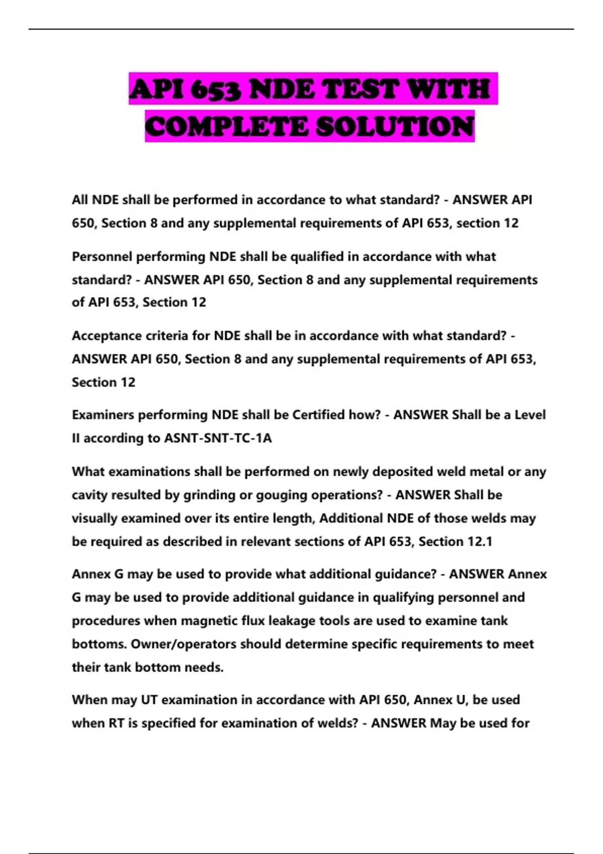 API 653 NDE TEST WITH COMPLETE SOLUTION