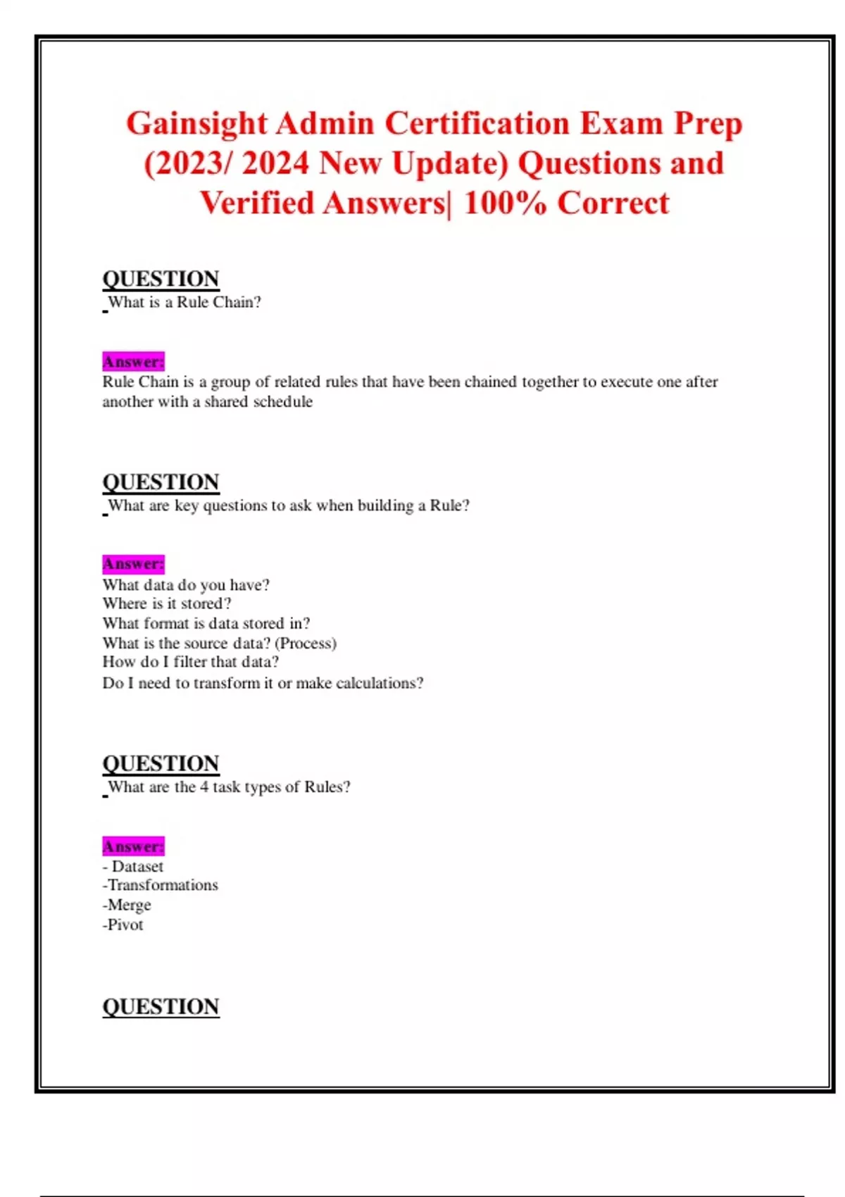 Gainsight Admin Certification Exam Prep (2023/ 2024 New Update) Questions and Verified Answers| 100% Correct QUESTION What is a Rule Chain? Rule Chain is a group of related rules that have been chained together to execute one after another with a shared schedule QUESTION What are key questions to ask when building a Rule? Answer: What data do you have? Where is it stored? What format is data stored in? What is the source data? (Process) How do I filter that data? Do I need to transform it or make calculations? QUESTION What are the 4 task types of Rules? Answer: - Dataset -Transformations -Merge -Pivot QUESTION What does "Apply to Gainsight Customer Only" mean when creating a Rule? Answer: Means it will limit to only customers in your Gainsight Data (your customer info object) QUESTION In Rules Engine, will advancing along the setup actions save your work as you go? Answer: NO! You have to hit "Next" in order to save your work, rather than clicking through the setup actions at the top QUESTION What is the benefit of selecting "Include in Identifiers" when creating a Rule? Answer: Click "Include in Identifiers" to help prevent duplicate CTAs based off vague qualifiers QUESTION The purpose of the Rules Engine is to: Answer: - Leverage customer lifecycle - Leverage data you have for analysis - Leverage data you have for monitoring and action QUESTION The anatomy of a rule contains the following steps: Answer: Create Rule, (Edit Rule), Set up Rule, Set up Action, and Schedule QUESTION If a Worksheet=Object, column=__ ? Answer: Field- think of an excel workbook QUESTION The default view which has rules in alphabetical order is: