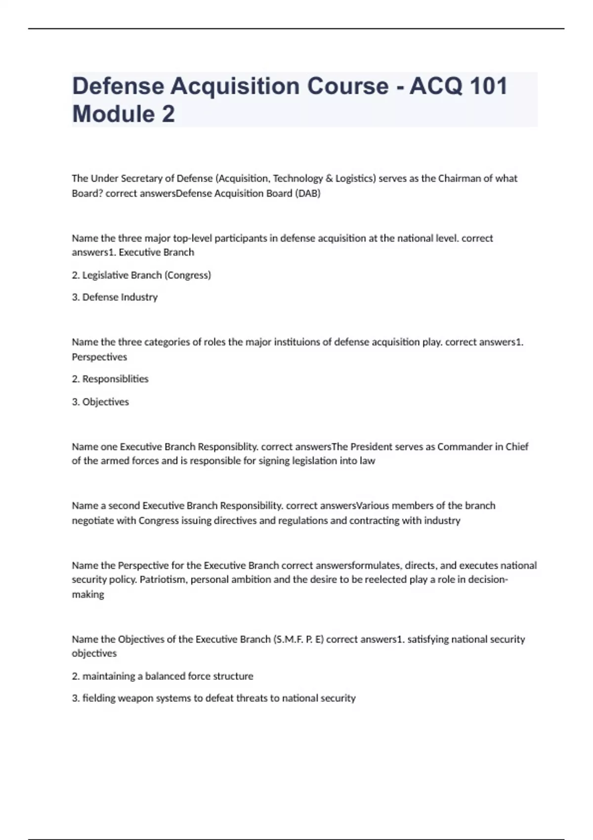 Defense Acquisition Course - ACQ 101 Module 2 exam with 100% complete solutions