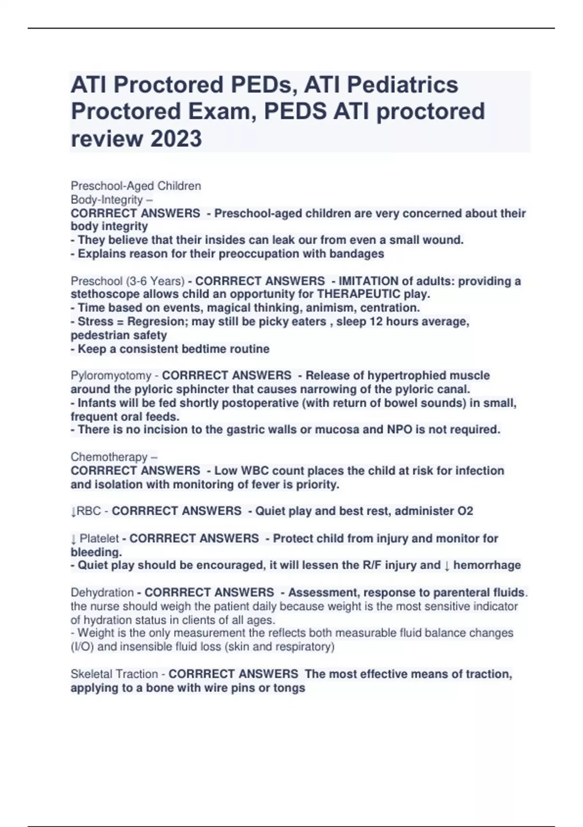 ATI Proctored PEDs, ATI Pediatrics Proctored Exam, PEDS ATI proctored review 2023 Preschool-Aged Children Body-Integrity – CORRRECT ANSWERS - Preschool-aged children are very concerned about their body integrity - They believe that their insides can leak our from even a small wound. - Explains reason for their preoccupation with bandages Preschool (3-6 Years) - CORRRECT ANSWERS - IMITATION of adults: providing a stethoscope allows child an opportunity for THERAPEUTIC play. - Time based on events, magical thinking, animism, centration. - Stress = Regresion; may still be picky eaters , sleep 12 hours average, pedestrian safety - Keep a consistent bedtime routine Pyloromyotomy - CORRRECT ANSWERS - Release of hypertrophied muscle around the pyloric sphincter that causes narrowing of the pyloric canal. - Infants will be fed shortly postoperative (with return of bowel sounds) in small, frequent oral feeds. - There is no incision to the gastric walls or mucosa and NPO is not required. Chemotherapy – CORRRECT ANSWERS - Low WBC count places the child at risk for infection and isolation with monitoring of fever is priority. ↓RBC - CORRRECT ANSWERS - Quiet play and best rest, administer O2 ↓ Platelet - CORRRECT ANSWERS - Protect child from injury and monitor for bleeding. - Quiet play should be encouraged, it will lessen the R/F injury and ↓ hemorrhage Dehydration - CORRRECT ANSWERS - Assessment, response to parenteral fluids. the nurse should weigh the patient daily because weight is the most sensitive indicator of hydration status in clients of all ages. - Weight is the only measurement the reflects both measurable fluid balance changes (I/O) and insensible fluid loss (skin and respiratory) Skeletal Traction - CORRRECT ANSWERS The most effective means of traction, applying to a bone with wire pins or tongs Compartment Syndrome – CORRRECT ANSWERS Involves the compression of nerves and blood vessels due to swelling within the enclosed space created by the fascia that separates groups of muscles Acute Glomerulonephritis – CORRRECT ANSWERS - ASO titer will indicate if the child has had a recent strep infection. In determining a definitive diagnosis for acute glomerulonephritis. - Elevated RBCs is expected and the presence of hematuria - Monitor B.P. Q4hr due to ↑HTN