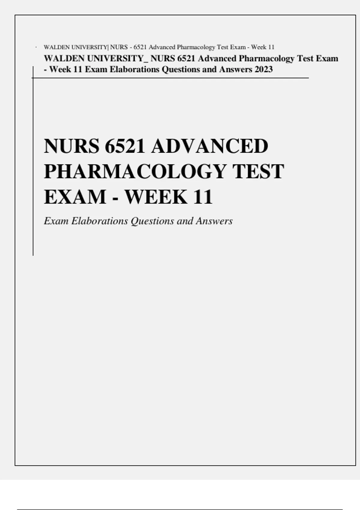 WALDEN UNIVERSITY_ NURS 6521 Advanced Pharmacology Test Exam - Week 11 Exam Elaborations Questions and Answers 2023 Latest Verified Review 2023 Practice Questions and Answers for Exam Preparation, 100% Correct with Explanations, Highly Recommended, Downlo
