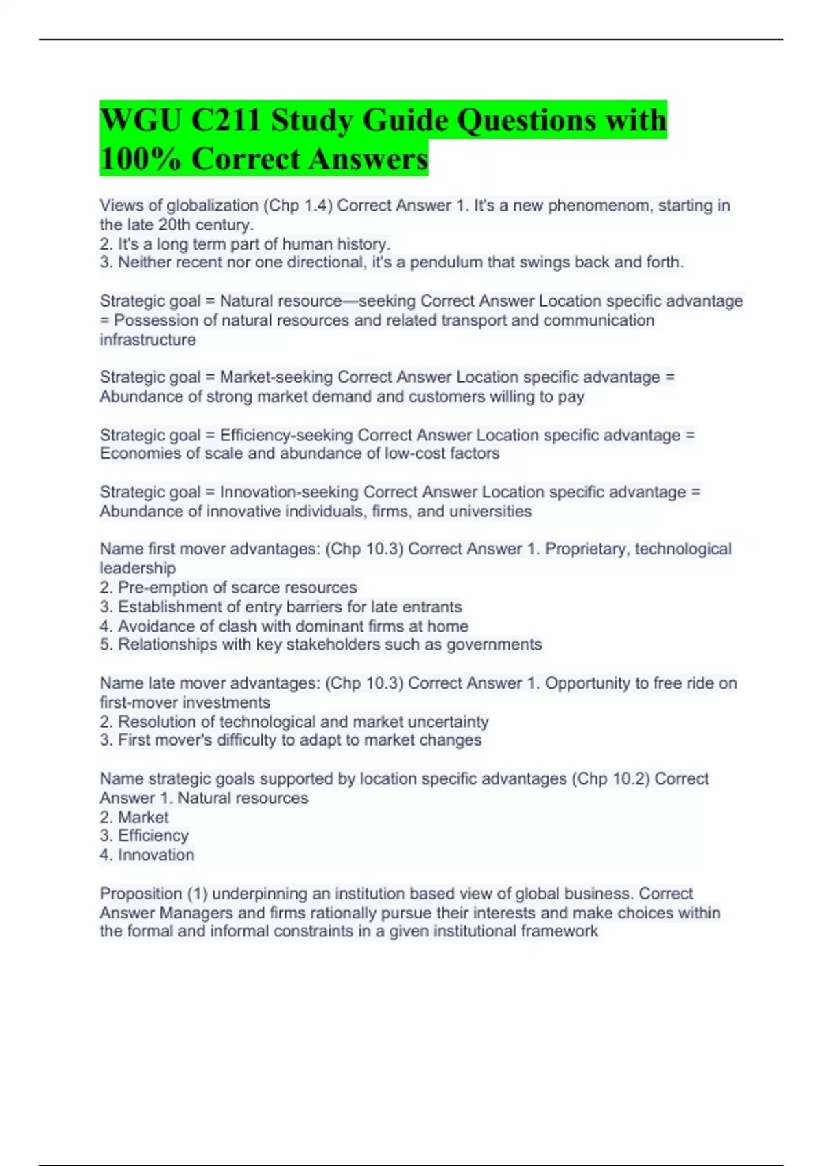 Views of globalization (Chp 1.4) Correct Answer 1. It's a new phenomenom, starting in the late 20th century. 2. It's a long term part of human history. 3. Neither recent nor one directional, it's a pendulum that swings back and forth. Strategic goal = Natural resource—seeking Correct Answer Location specific advantage = Possession of natural resources and related transport and communication infrastructure Strategic goal = Market-seeking Correct Answer Location specific advantage = Abundance of strong market demand and customers willing to pay Strategic goal = Efficiency-seeking Correct Answer Location specific advantage = Economies of scale and abundance of low-cost factors Strategic goal = Innovation-seeking Correct Answer Location specific advantage = Abundance of innovative individuals, firms, and universities Name first mover advantages: (Chp 10.3) Correct Answer 1. Proprietary, technological leadership 2. Pre-emption of scarce resources 3. Establishment of entry barriers for late entrants 4. Avoidance of clash with dominant firms at home 5. Relationships with key stakeholders such as governments Name late mover advantages: (Chp 10.3) Correct Answer 1. Opportunity to free ride on first-mover investments 2. Resolution of technological and market uncertainty 3. First mover's difficulty to adapt to market changes Name strategic goals supported by location specific advantages (Chp 10.2) Correct Answer 1. Natural resources 2. Market 3. Efficiency 4. Innovation Proposition (1) underpinning an institution based view of global business. Correct Answer Managers and firms rationally pursue their interests and make choices within the formal and informal constraints in a given institutional framework