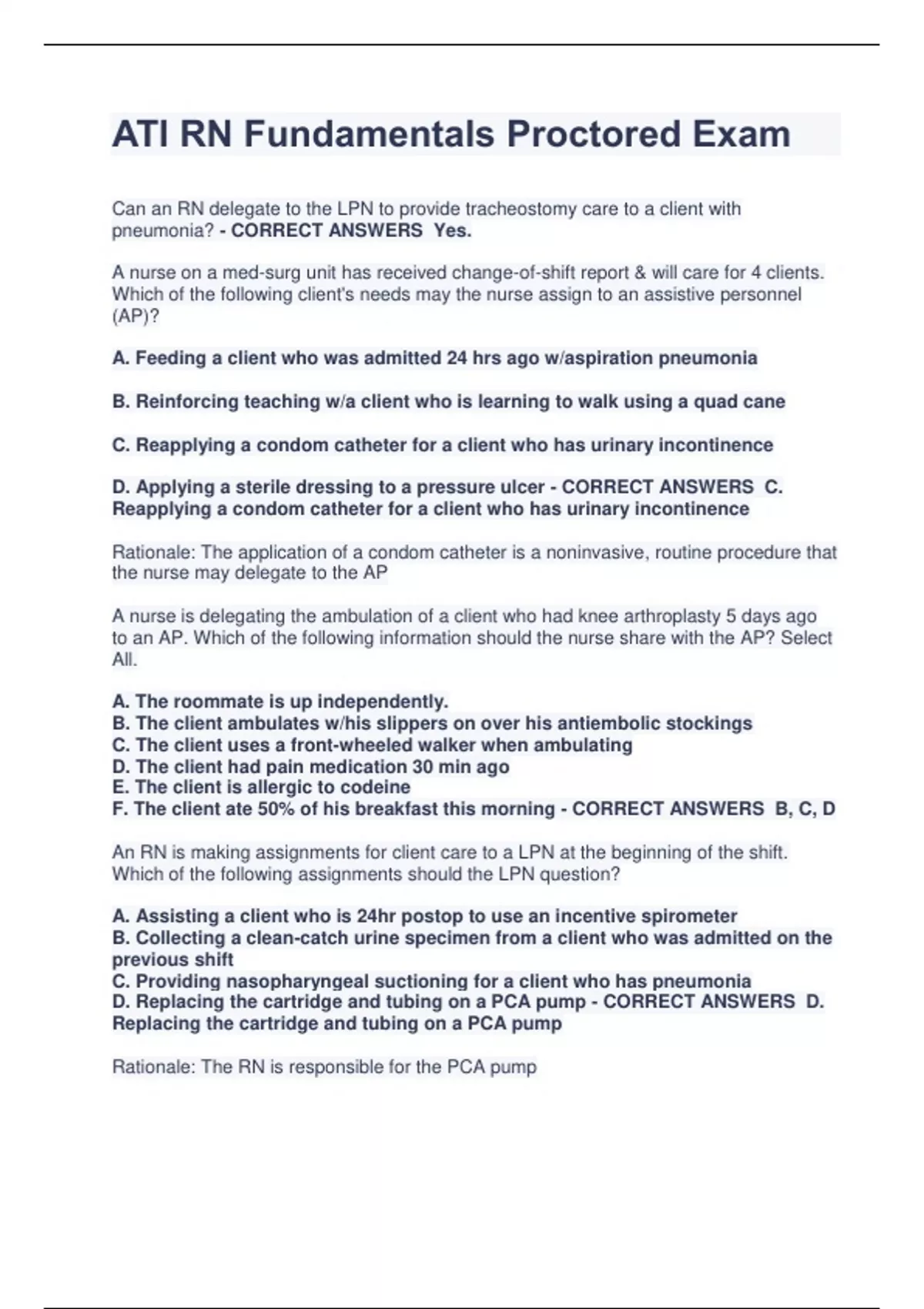 ATI RN Fundamentals Proctored Exam Can an RN delegate to the LPN to provide tracheostomy care to a client with pneumonia? - CORRECT ANSWERS Yes. A nurse on a med-surg unit has received change-of-shift report & will care for 4 clients. Which of the following client's needs may the nurse assign to an assistive personnel (AP)? A. Feeding a client who was admitted 24 hrs ago w/aspiration pneumonia B. Reinforcing teaching w/a client who is learning to walk using a quad cane C. Reapplying a condom catheter for a client who has urinary incontinence D. Applying a sterile dressing to a pressure ulcer - CORRECT ANSWERS C. Reapplying a condom catheter for a client who has urinary incontinence Rationale: The application of a condom catheter is a noninvasive, routine procedure that the nurse may delegate to the AP A nurse is delegating the ambulation of a client who had knee arthroplasty 5 days ago to an AP. Which of the following information should the nurse share with the AP? Select All. A. The roommate is up independently. B. The client ambulates w/his slippers on over his antiembolic stockings C. The client uses a front-wheeled walker when ambulating D. The client had pain medication 30 min ago E. The client is allergic to codeine F. The client ate 50% of his breakfast this morning - CORRECT ANSWERS B, C, D An RN is making assignments for client care to a LPN at the beginning of the shift. Which of the following assignments should the LPN question? A. Assisting a client who is 24hr postop to use an incentive spirometer B. Collecting a clean-catch urine specimen from a client who was admitted on the previous shift C. Providing nasopharyngeal suctioning for a client who has pneumonia D. Replacing the cartridge and tubing on a PCA pump - CORRECT ANSWERS D. Replacing the cartridge and tubing on a PCA pump Rationale: The RN is responsible for the PCA pump A nurse is preparing an in-service program about delegation. Which of the following elements should she identify when presenting the 5 rights of delegation? Select all. A. Right client B. Right supervision/evaluation C. Right direction/communication D. Right time E. Right circumstances - CORRECT ANSWERS B, C, E A and D are rights of medication administration A nurse manager of a med-surg unit is assigning care responsibilities for the oncoming shift. A client is awaiting transfer back to the unit from the PACU following thoracic surgery. To which staff member should the nurse assign to this client? A. Charge nurse B. RN C. LPN D. AP - CORRECT ANSWERS B. RN Can an RN delegate to the LPN to provide tracheostomy care to a client with pneumonia? - CORRECT ANSWERS Yes. A nurse on a med-surg unit has received change-of-shift report & will care for 4 clients. Which of the following client's needs may the nurse assign to an assistive personnel (AP)? A. Feeding a client who was admitted 24 hrs ago w/aspiration pneumonia B. Reinforcing teaching w/a client who is learning to walk using a quad cane C. Reapplying a condom catheter for a client who has urinary incontinence D. Applying a sterile dressing to a pressure ulcer - CORRECT ANSWERS C. Reapplying a condom catheter for a client who has urinary incontinence Rationale: The application of a condom catheter is a noninvasive, routine procedure that the nurse may delegate to the AP A nurse is delegating the ambulation of a client who had knee arthroplasty 5 days ago to an AP. Which of the following information should the nurse share with the AP? Select All. A. The roommate is up independently. B. The client ambulates w/his slippers on over his antiembolic stockings C. The client uses a front-wheeled walker when ambulating D. The client had pain medication 30 min ago E. The client is allergic to codeine F. The client ate 50% of his breakfast this morning - CORRECT ANSWERS B, C, D An RN is making assignments for client care to a LPN at the beginning of the shift. Which of the following assignments should the LPN question? A. Assisting a client who is 24hr postop to use an incentive spirometer B. Collecting a clean-catch urine specimen from a client who was admitted on the previous shift C. Providing nasopharyngeal suctioning for a client who has pneumonia D. Replacing the cartridge and tubing on a PCA pump - CORRECT ANSWERS D. Replacing the cartridge and tubing on a PCA pump Rationale: The RN is responsible for the PCA pump A nurse is preparing an in-service program about delegation. Which of the following elements should she identify when presenting the 5 rights of delegation? Select all. A. Right client B. Right supervision/evaluation C. Right direction/communication D. Right time E. Right circumstances - CORRECT ANSWERS B, C, E A and D are rights of medication administration A nurse manager of a med-surg unit is assigning care responsibilities for the oncoming shift. A client is awaiting transfer back to the unit from the PACU following thoracic surgery. To which staff member should the nurse assign to this client? A. Charge nurse B. RN C. LPN D. AP - CORRECT ANSWERS B. RN