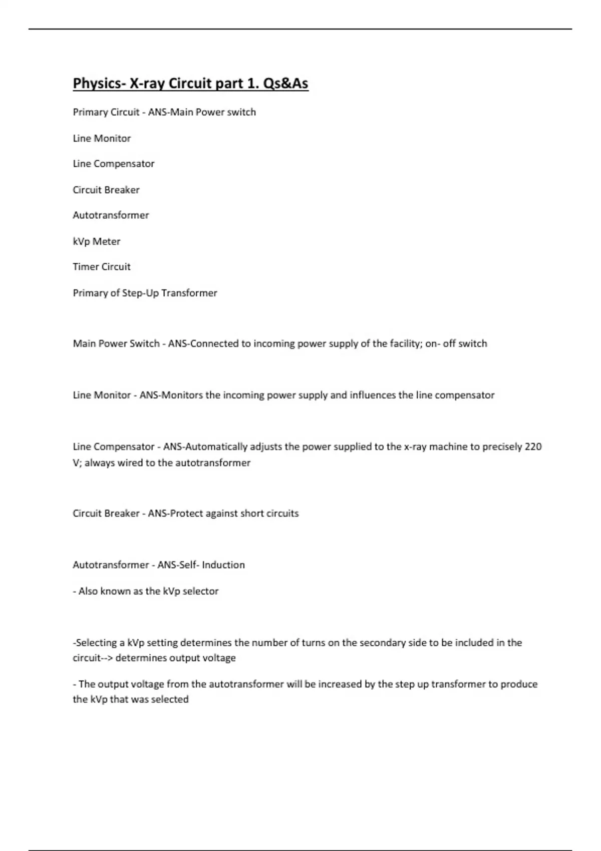 Physics- X-ray Circuit part 1. Qs&As Primary Circuit - ANS-Main Power switch Line Monitor Line Compensator Circuit Breaker Autotransformer kVp Meter Timer Circuit Primary of Step-Up Transformer Main Power Switch - ANS-Connected to incoming power supply of the facility; on- off switch Line Monitor - ANS-Monitors the incoming power supply and influences the line compensator Line Compensator - ANS-Automatically adjusts the power supplied to the x-ray machine to precisely 220 V; always wired to the autotransformer Circuit Breaker - ANS-Protect against short circuits Autotransformer - ANS-Self- Induction - Also known as the kVp selector -Selecting a kVp setting determines the number of turns on the secondary side to be included in the circuit--> determines output voltage - The output voltage from the autotransformer will be increased by the step up transformer to produce the kVp that was selected CONTINUES...