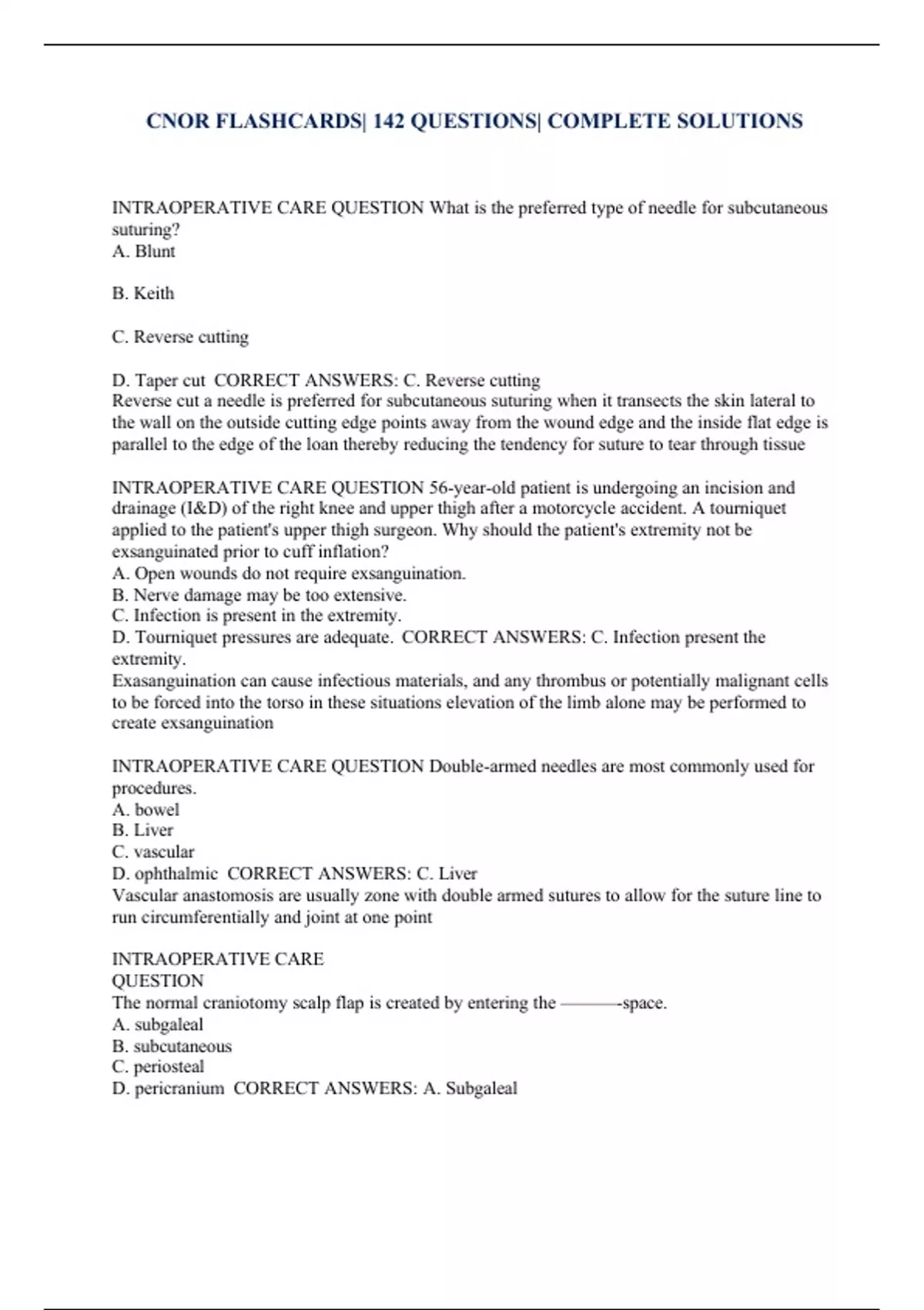 CNOR FLASHCARDS| 142 QUESTIONS| COMPLETE SOLUTIONS What is the preferred type of needle for subcutaneous suturing? A. Blunt B. Keith C. Reverse cutting D. Taper cut