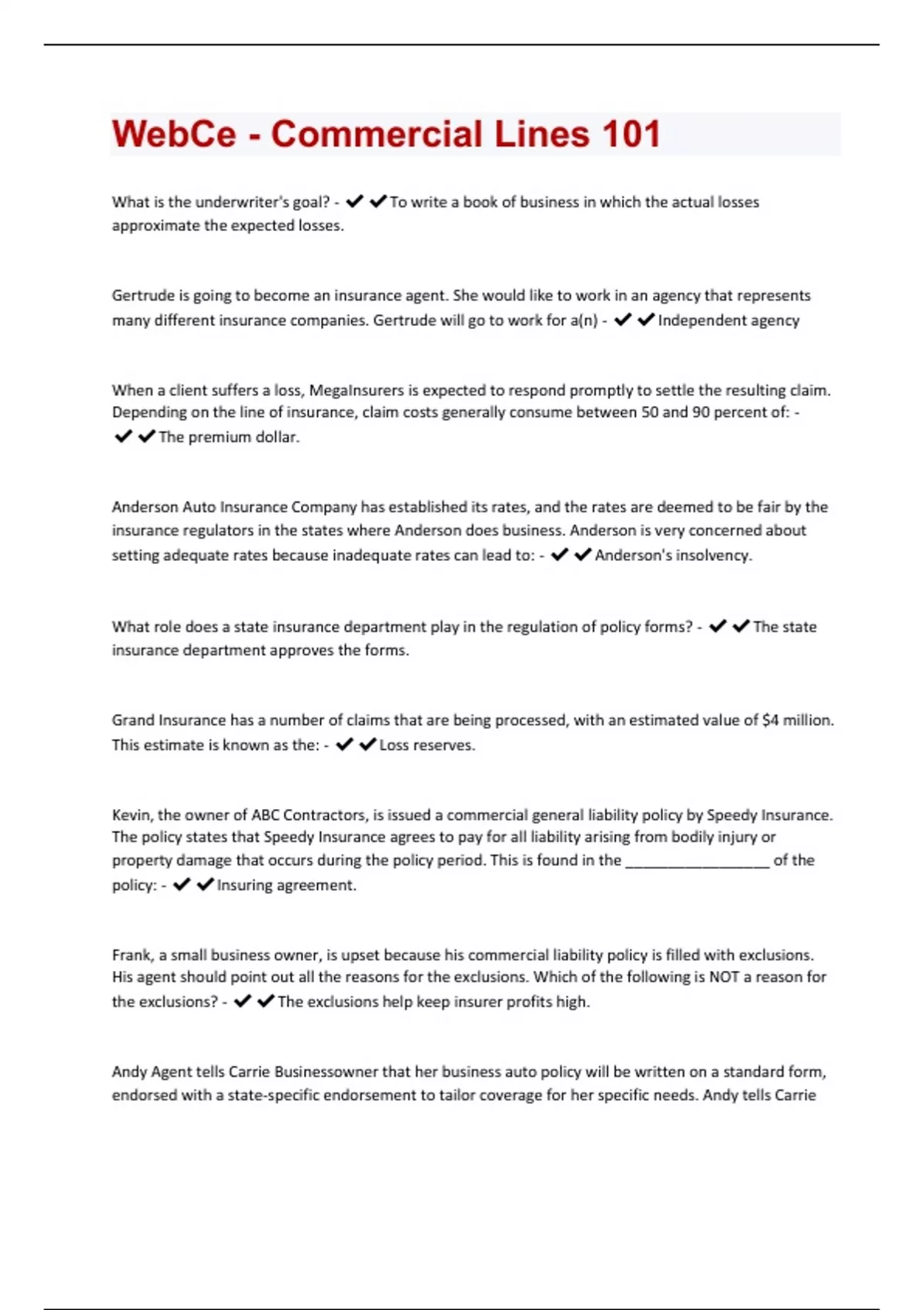 WebCe - Commercial Lines 101 Questions With Correct Answers Already Passed!!