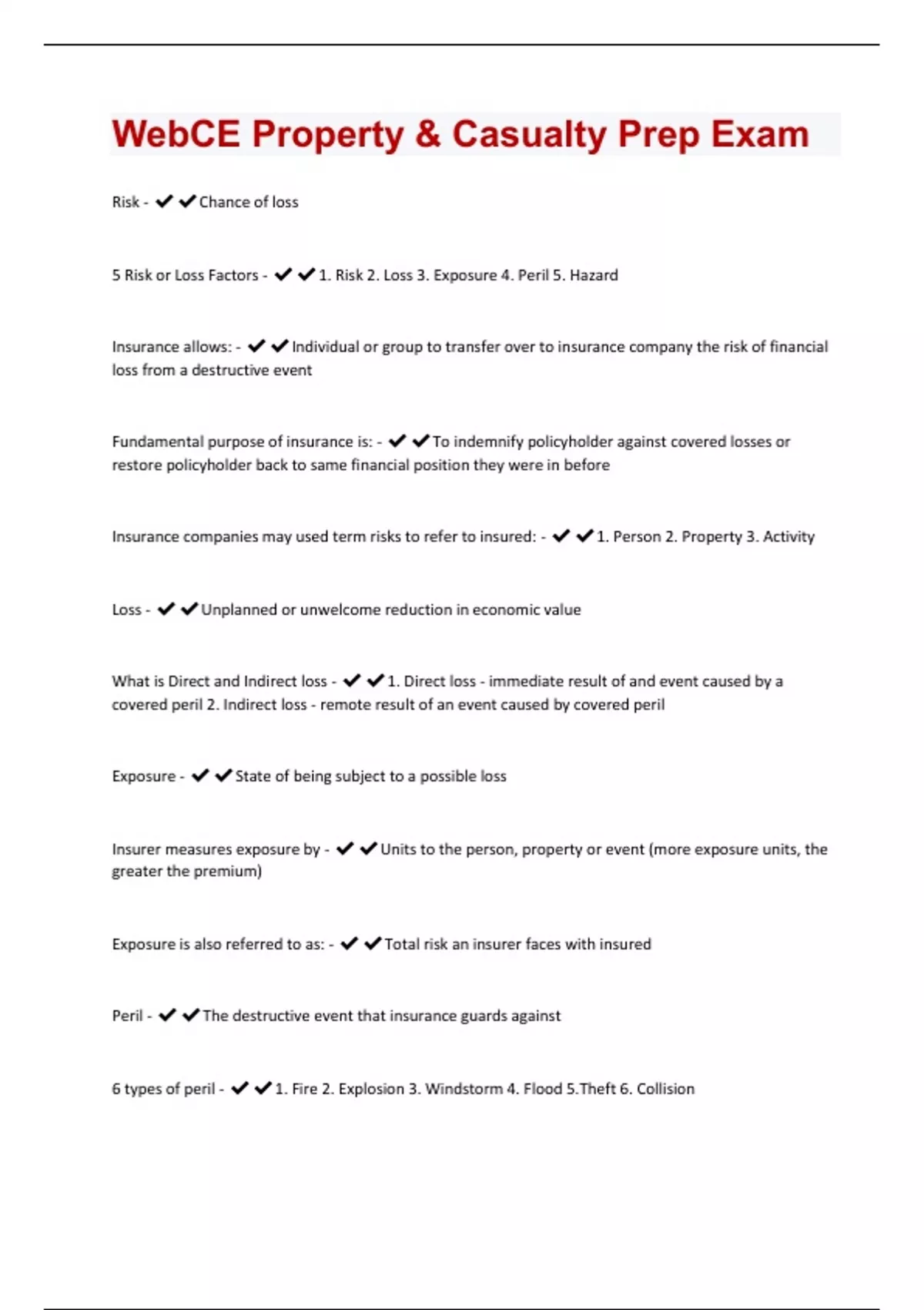 Risk - Chance of loss 5 Risk or Loss Factors - 1. Risk 2. Loss 3. Exposure 4. Peril 5. Hazard Insurance allows: - Individual or group to transfer over to insurance company the risk of financial loss from a destructive event Fundamental purpose of insurance is: - To indemnify policyholder against covered losses or restore policyholder back to same financial position they were in before Insurance companies may used term risks to refer to insured: - 1. Person 2. Property 3. Activity Loss - Unplanned or unwelcome reduction in economic value What is Direct and Indirect loss - 1. Direct loss - immediate result of and event caused by a covered peril 2. Indirect loss - remote result of an event caused by covered peril Exposure - State of being subject to a possible loss Insurer measures exposure by - Units to the person, property or event (more exposure units, the greater the premium) Exposure is also referred to as: - Total risk an insurer faces with insured Peril - The destructive event that insurance guards against 6 types of peril - 1. Fire 2. Explosion 3. Windstorm 4. Flood 5.Theft 6. CollisionInsurance policy provides - Financial protection against losses caused by specified peril Havard - Is condition that increases the likely occurrence of a peril or severity of a loss Name the 3 types of hazards - 1. Moral 2. Morale 3. Physical Moral hazard - Tendencies or traits of an individual that increases the chance of a loss Morale hazard - Tendencies of individual that increase the chance of a loss from state of mind, attitude, or indifference Physical Hazard - Physical conditions that increase the chance of loss