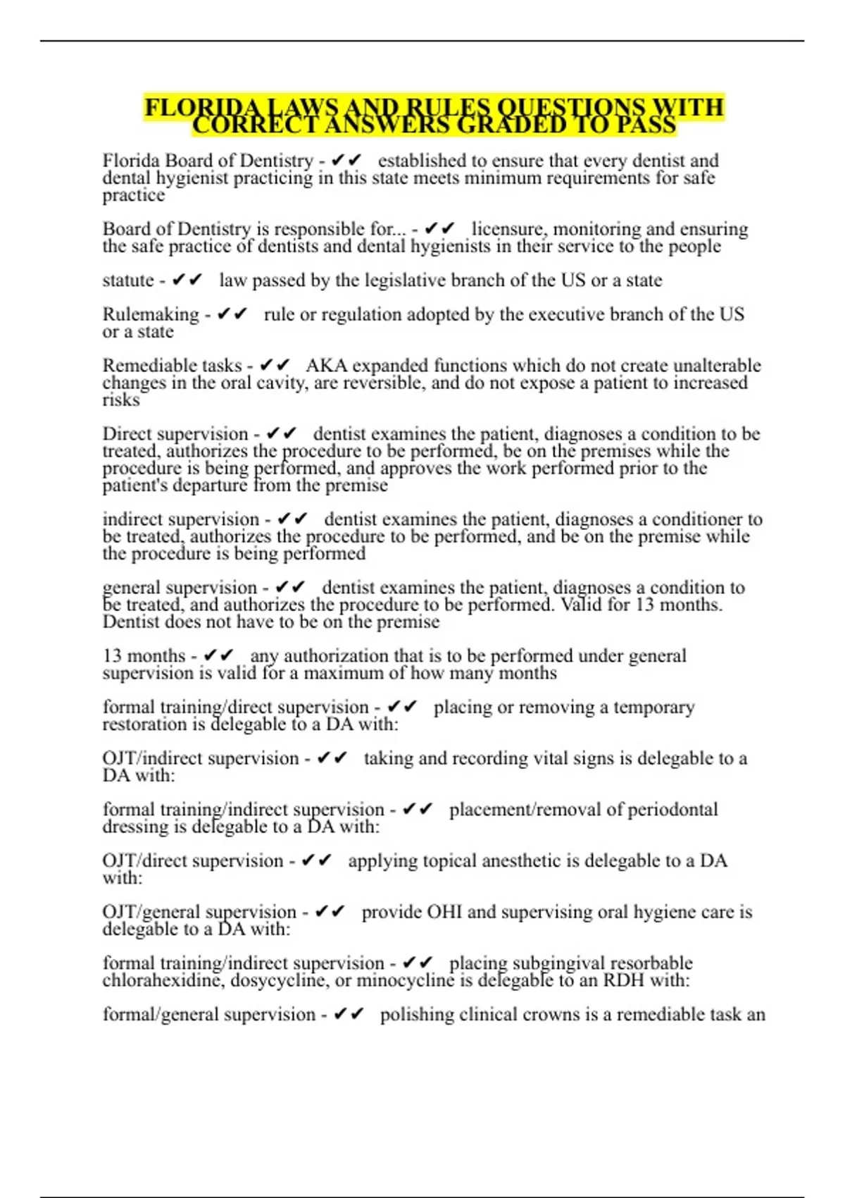 FLORIDA LAWS AND RULES QUESTIONS WITH CORRECT ANSWERS GRADED TO PASS