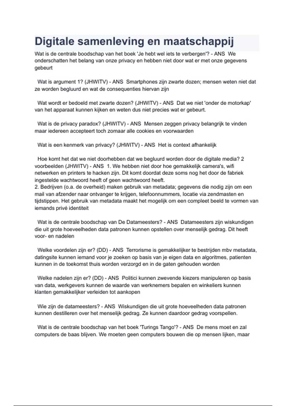 Digitale samenleving en maatschappij Wat is de centrale boodschap van het boek 'Je hebt wel iets te verbergen'? - ANS We onderschatten het belang van onze privacy en hebben niet door wat er met onze gegevens gebeurt Wat is argument 1? (JHWITV) - ANS Smartphones zijn zwarte dozen; mensen weten niet dat ze worden begluurd en wat de consequenties hiervan zijn Wat wordt er bedoeld met zwarte dozen? (JHWITV) - ANS Dat we niet 'onder de motorkap' van het apparaat kunnen kijken en weten dus niet precies wat er gebeurt. Wat is de privacy paradox? (JHWITV) - ANS Mensen zeggen privacy belangrijk te vinden maar iedereen accepteert toch zomaar alle cookies en voorwaarden Wat is een kenmerk van privacy? (JHWITV) - ANS Het is context afhankelijk Hoe komt het dat we niet doorhebben dat we begluurd worden door de digitale media? 2 voorbeelden (JHWITV) - ANS 1. We hebben niet door hoe gemakkelijk camera's, wifi netwerken en printers te hacken zijn. Dit komt doordat deze soms nog het door de fabriek ingestelde wachtwoord heeft of geen wachtwoord heeft. 2. Bedrijven (o.a. de overheid) maken gebruik van metadata; gegevens die nodig zijn om een mail van afzender naar ontvanger te krijgen, telefoonnummers, locatie via zendmasten en tijdstippen. Het gebruik van metadata maakt het mogelijk om een compleet beeld te vormen van iemands privé identiteit Wat is de centrale boodschap van De Datameesters? - ANS Datameesters zijn wiskundigen die uit grote hoeveelheden data patronen kunnen opstellen over menselijk gedrag. Dit heeft voor- en nadelen Welke voordelen zijn er? (DD) - ANS Terrorisme is gemakkelijker te bestrijden mbv metadata, datingsite kunnen iemand voor je zoeken op basis van je eigen data en algoritmes, patienten kunnen in de toekomst thuis worden verzorgd en in de gaten gehouden worden Welke nadelen zijn er? (DD) - ANS Politici kunnen zwevende kiezers manipuleren op basis van data, werkgevers kunnen de waarde van werknemers bepalen en winkeliers kunnen klanten gemakkelijker verleiden tot aankopen Wie zijn de datameesters? - ANS Wiskundigen die uit grote hoeveelheden data patronen kunnen destilleren over het menselijk gedrag. Ze kunnen daardoor gedrag voorspellen. Wat is de centrale boodschap van het boek 'Turings Tango'? - ANS De mens moet en zal computers de baas blijven. We moeten geen computers bouwen die op mensen lijken, maar aansturen op een relatie waarbij sterke punten van beide worden gecombineerd. De mens en de computer moet een goed tangopaar vormen Waarom heet het boek Turings Tango? - ANS Het boek heeft betrekking op het werk van Alan Turing, die de Turing machine en de Turing test heeft gemaakt. De test moest antwoord geven op de vraag of een machine kan denken en menselijke intelligentie kan tonen. Het tango gedeelte slaat op het idee dat de mens en de computer moeten samenwerken