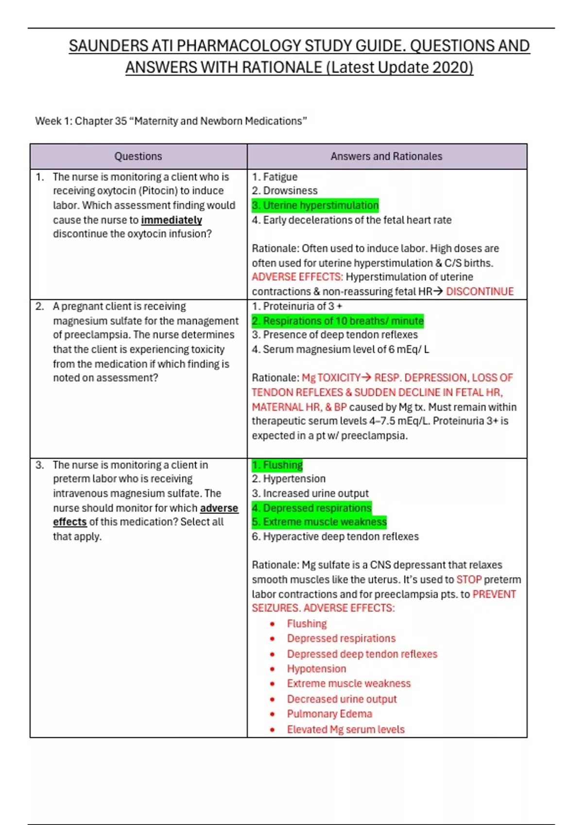 SAUNDERS ATI PHARMACOLOGY STUDY GUIDE. QUESTIONS AND ANSWERS WITH RATIONALE (Latest Update 2020)