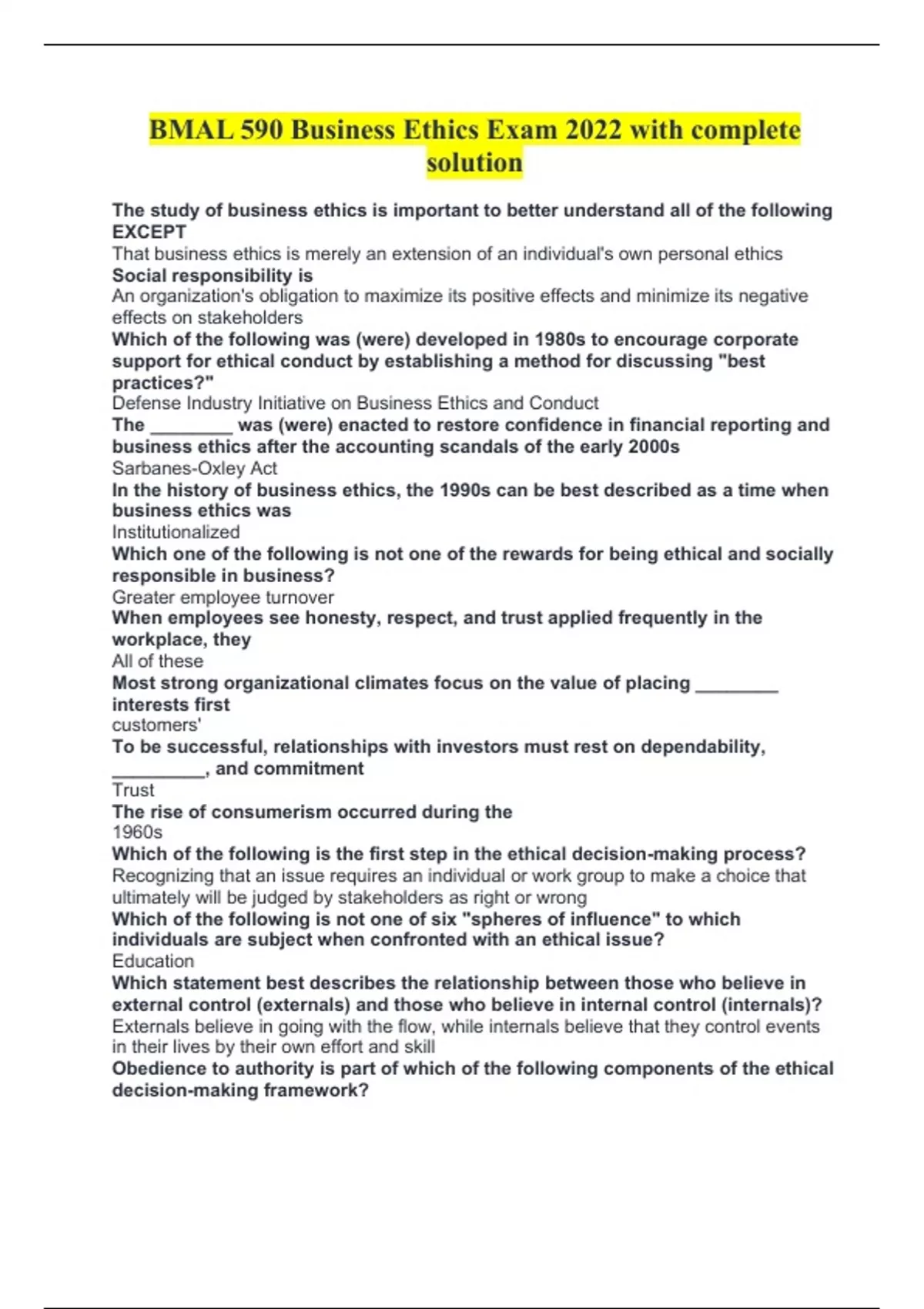 BMAL 590 Business Ethics Exam 2022 with complete solution