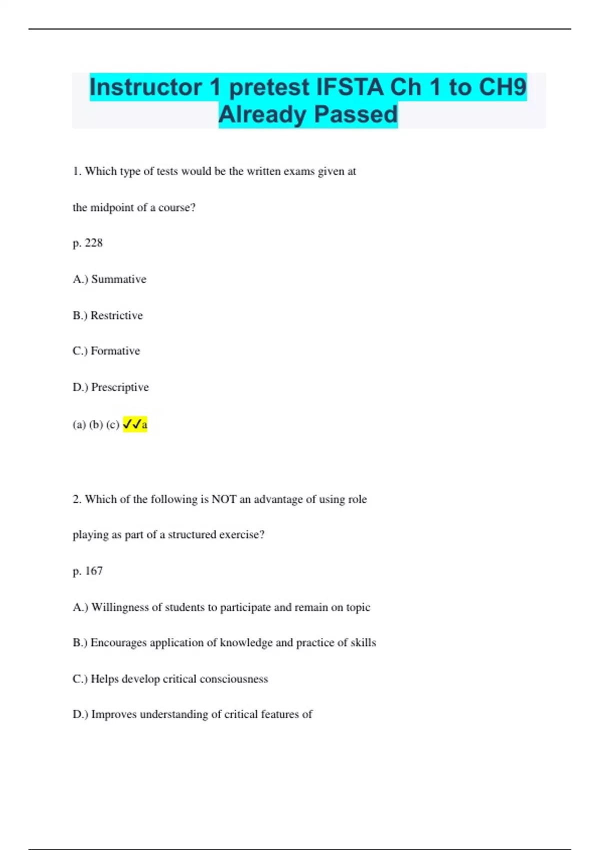Instructor 1 pretest IFSTA Ch 1 to CH9 Already Passed 1. Which type of tests would be the written exams given at the midpoint of a course? p. 228 A.) Summative B.) Restrictive C.) Formative D.) Prescriptive (a) (b) (c) a 2. Which of the following is NOT an advantage of using role playing as part of a structured exercise? p. 167 A.) Willingness of students to participate and remain on topic B.) Encourages application of knowledge and practice of skills C.) Helps develop critical consciousness D.) Improves understanding of critical features of interpersonal relations (a) (b) (c) a 3. Which of the following remote locations can be used for standpipe operations training? p. 116 A.) Warehouses B.) Grain elevators C.) Industrial sites D.) Parking garages (a) (b) (c) d 4. What is the first thing that must be done when an instructor is preparing to teach a new topic? p. 52 A.) Collect needed visual aids B.) Review the prepared lesson plan C.) Survey the students to determine knowledge base D.) Gain thorough knowledge of the subject (a) (b) (c) d 5. What is the most prevalent approach to teaching in the fire and emergency services? p. 143 A.) Instructor-led B.) Student-led C.) Independent learning D.) Distance learning (a) (b) (c) a 6. Which national organization has as its founding purpose the accreditation and certification of fire and emergency service organizations and personnel? p. 198 A.) ACCP B.) IFSAX C.) NAFTD D.) FDSOA (a) (b) (c) b 7. Which incandescent bulbs should be unscrewed to make images on the projector screen easier to see? p. 111 A.) Above the screen B.) Above the instructor C.) In the rear of the room D.) Near the students (a) (b) (c) a 8. Who serves as a primary role model for stude