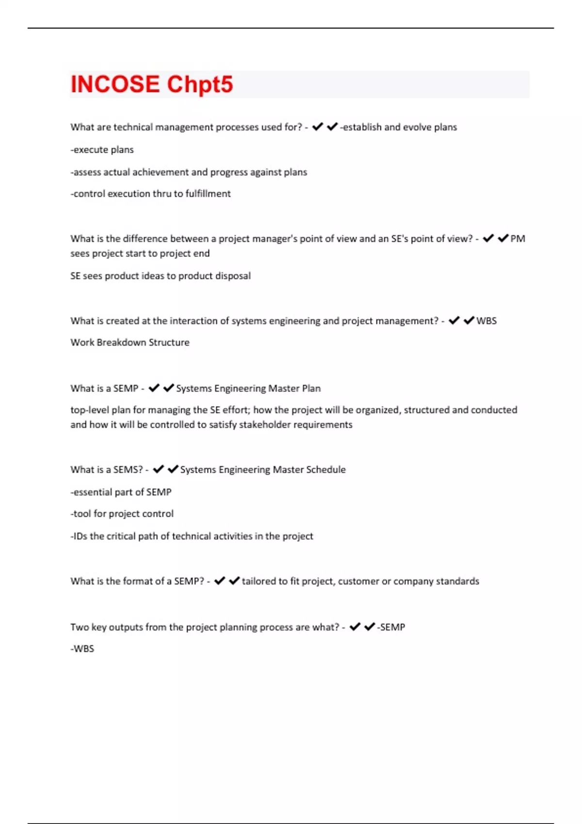 What are technical management processes used for? - -establish and evolve plans -execute plans -assess actual achievement and progress against plans -control execution thru to fulfillment What is the difference between a project manager's point of view and an SE's point of view? - PM sees project start to project end SE sees product ideas to product disposal What is created at the interaction of systems engineering and project management? - WBS Work Breakdown Structure What is a SEMP - Systems Engineering Master Plan top-level plan for managing the SE effort; how the project will be organized, structured and conducted and how it will be controlled to satisfy stakeholder requirements What is a SEMS? - Systems Engineering Master Schedule -essential part of SEMP -tool for project control -IDs the critical path of technical activities in the project What is the format of a SEMP? - tailored to fit project, customer or company standards Two key outputs from the project planning process are what? - -SEMP -WBSWhat is the purpose of Project Planning Process? - to produce and coordinate effective and workable plans What does project planning do? - establishes the direction and infrastructure necessary to enable the assessment and control of the project progress and identifies the details of the work and the reight set of personnel, skills and facilities What 4 artifacts are definitely included in a SEMP? - -Technical reviews -SEMS -WBS -TPM (Technical Performance measures) What are methods of verification? - inspection, analysis, demonstration and test What is the purpose of the project assessment and control Process? - -assess if the plans are aligned and feasible -determine the status of the project -technical and process performance -direct execution in accordance with plans, schedule, and budget When should assessments be scheduled? - -Periodically and for all milestones and decision gates What process may trigger other technical management processes? - project assessment and control What are 3 key "initiates" while controlling the project? - -Initiate preventative actions when assessments indicate a trend toward deviation -Initiate problem resolution when assessments indicate nonconformance with performance success criteria -Initiate corrective actions when assessments indicate deviation from approved plansWhat is the agile PM technique to project assessment and control? - -schedule frequent assessments -make project control adjustments on a tighter feedback cycle What is the purpose of the decision management process? - provide a structured, analytical framework for objectively identifying, characterizing and evaluating a set of alternatives for a decision at any point in the life cycle and select the most beneficial course of action