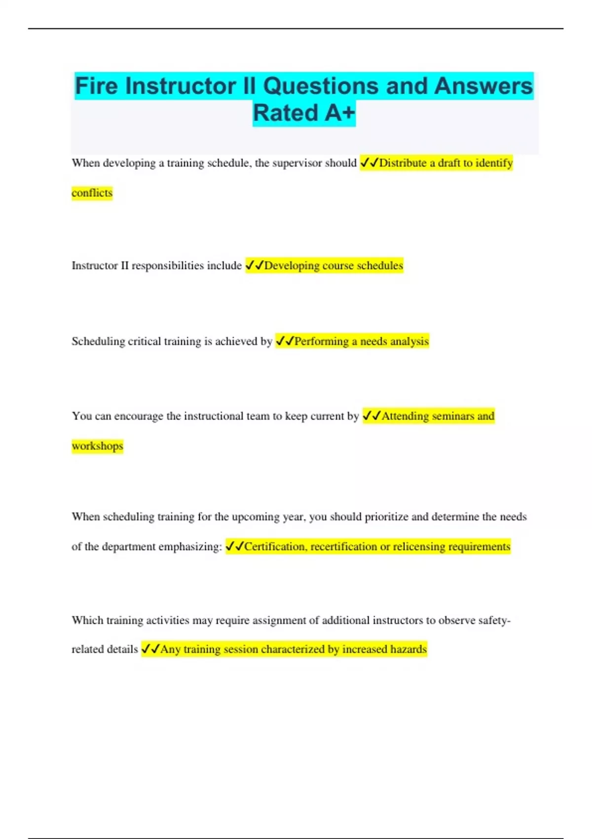 Fire Instructor II Questions and Answers Rated A+ When developing a training schedule, the supervisor should Distribute a draft to identify conflicts Instructor II responsibilities include Developing course schedules Scheduling critical training is achieved by Performing a needs analysis You can encourage the instructional team to keep current by Attending seminars and workshops When scheduling training for the upcoming year, you should prioritize and determine the needs of the department emphasizing: Certification, recertification or relicensing requirements Which training activities may require assignment of additional instructors to observe safety-related details Any training session characterized by increased hazards Resource management and course development are influenced by numerous factors including Instructor availability Which is an instructional resource Training materials Scheduling instructional sessions and developing a planning calendar are influenced by State or local requirements The initial step in establishing a training schedule is to Determine needs Which type of concerns do you need to consider when developing a department training schedule The areas of training needed A level of in service training is Skill/knowledge development A fire department training schedule may need to accommodate specialized areas of training, such as Vehicle operator training The administrative process used to determine the priorities and functions of the training program is Training needs assessment A system that organizes the required training areas into one document is a Master training schedule What should you do first when developing a master training schedule for your subordinate instructors Complete an agency needs assessment of the regulatory agencies that require training on specific topics When supervising training delivery by subordinate instructors Allow for individual styles and experiences in the training schedules In addition to demonstrating effective leadership skills, supervisors should be able to Coach and mentor instructors When coordinating training schedules, supervisors should remember that Larger classes are generally more cost effective Which is true concerning a needs analysis It compares the type of services being delivered with future needs A needs analysis is used to Identity future needs Which statement regarding the purchase of training resources is true When given budgetary approval, purchase training resources The — Operational Preparation of preliminary budgets for the upcoming fiscal year often start with Training cycle cost Which is used to justify preliminary budget figures Comparing agency needs against agency budget Which statement is correct Part of the purchasing process