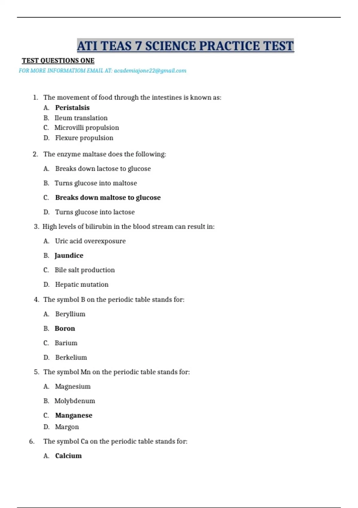 ATI TEAS 7 SCIENCE PRACTICE TEST TEST QUESTIONS ONE FOR MORE INFORMATIOM EMAIL AT: 1. The movement of food through the intestines is known as: A. Peristalsis B. Ileum translation C. Microvilli propulsion D. Flexure propulsion 2. The enzyme maltase does the following: A. Breaks down lactose to glucose B. Turns glucose into maltose C. Breaks down maltose to glucose D. Turns glucose into lactose