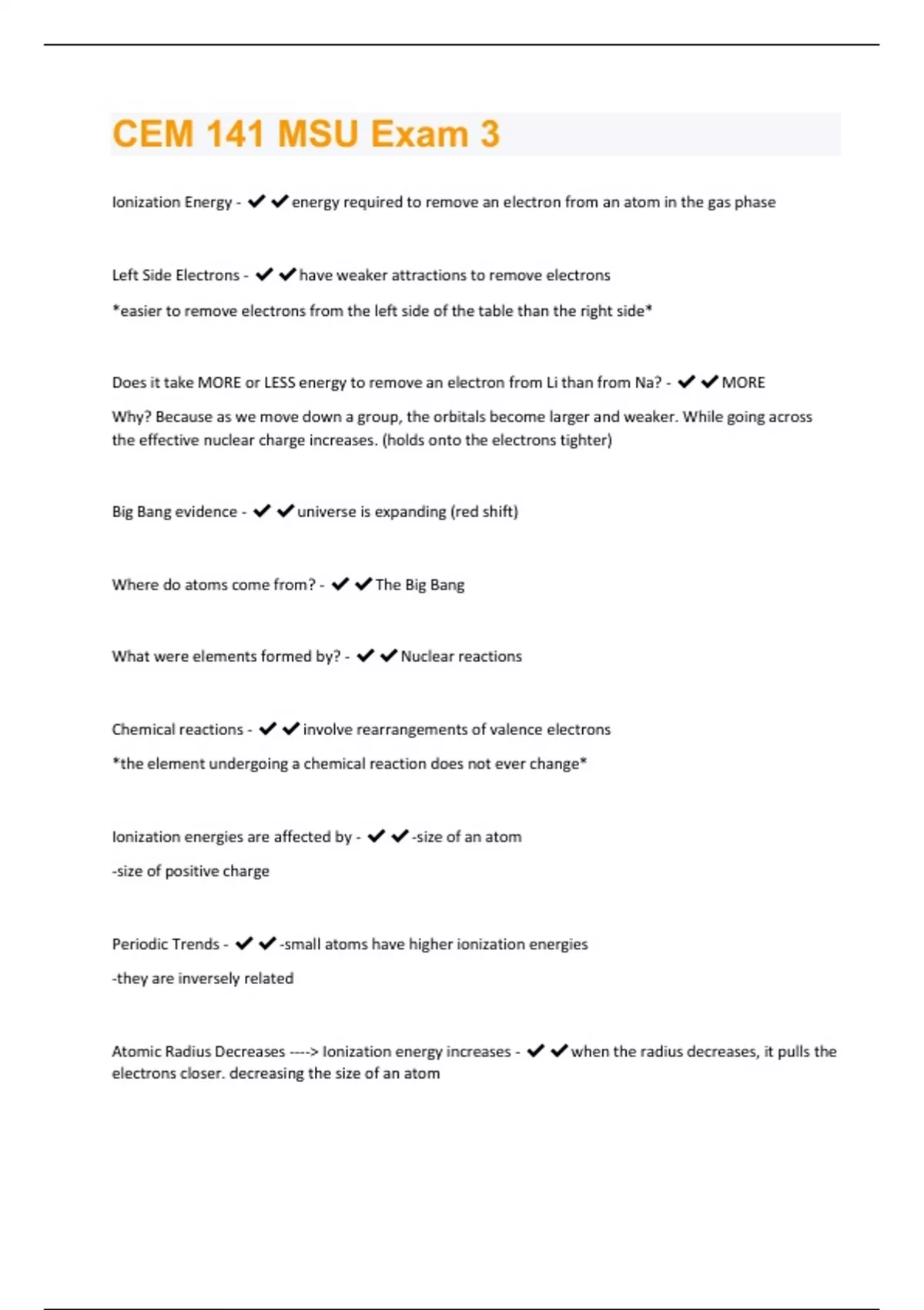 Ionization Energy - energy required to remove an electron from an atom in the gas phase Left Side Electrons - have weaker attractions to remove electrons *easier to remove electrons from the left side of the table than the right side* Does it take MORE or LESS energy to remove an electron from Li than from Na? - MORE Why? Because as we move down a group, the orbitals become larger and weaker. While going across the effective nuclear charge increases. (holds onto the electrons tighter) Big Bang evidence - universe is expanding (red shift) Where do atoms come from? - The Big Bang What were elements formed by? - Nuclear reactions Chemical reactions - involve rearrangements of valence electrons *the element undergoing a chemical reaction does not ever change* Ionization energies are affected by - -size of an atom -size of positive charge Periodic Trends - -small atoms have higher ionization energies -they are inversely related Atomic Radius Decreases ----> Ionization energy increases - when the radius decreases, it pulls the electrons closer. decreasing the size of an atomNuclear Reactions - Fusion and Fission Fusion - two lighter nuclei combines to form a heavier nucleus (energy released) Fission - a heavier nucleus is broken a part to form lighter, more stable nuclei energy Atomic # = - # of protons Atomic mass = - what's left over Do isolated atoms or molecules have melting or boiling points? - No Do isolated atoms or molecules exist in a state (solid, liquid, gas)? - No Why do bonds form between atoms? - because valence electrons are attracted to the nuclei of other atoms Covalent Bonds - two hydrogen atoms interact and form a covalent bond What properties do metals have? - -hard -conduct electricity -shiny -react w/water -malleable Bonding in Metals - atomic orbitals combine with each other to form molecular orbitals