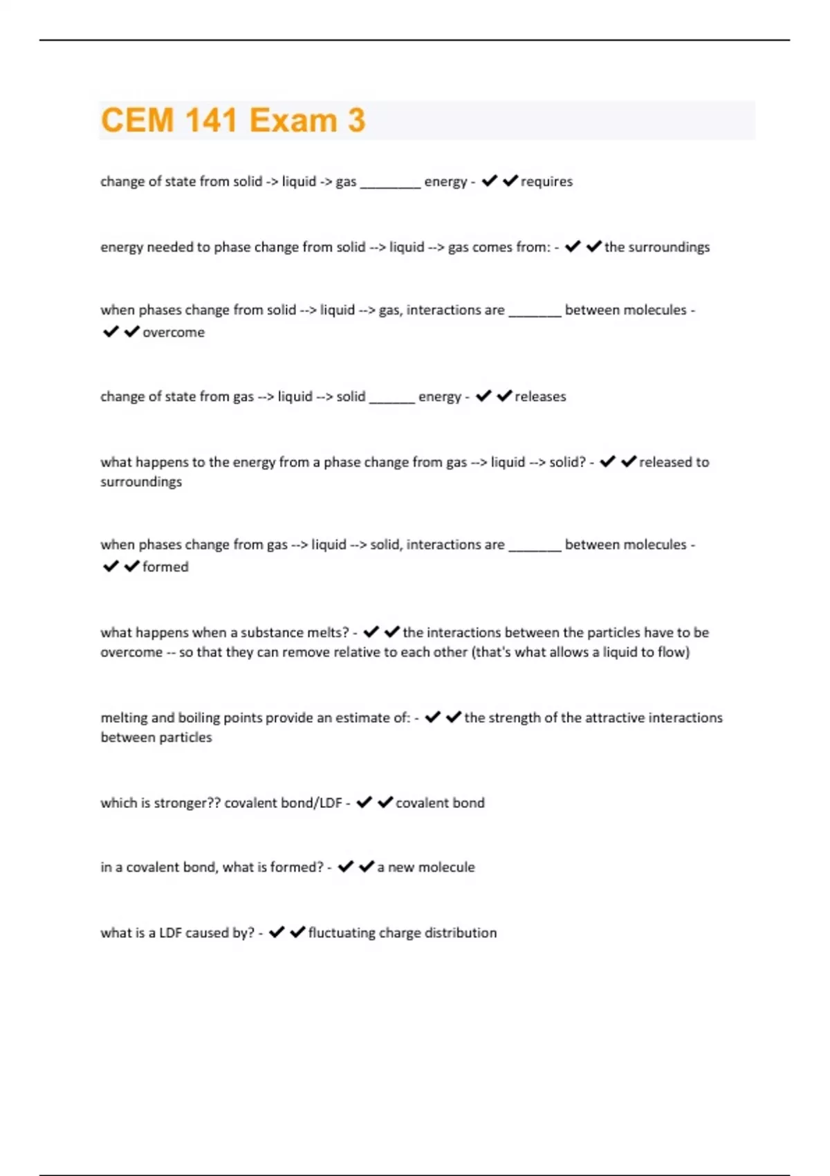 change of state from solid -> liquid -> gas ________ energy - requires energy needed to phase change from solid --> liquid --> gas comes from: - the surroundings when phases change from solid --> liquid --> gas, interactions are _______ between molecules - overcome change of state from gas --> liquid --> solid ______ energy - releases what happens to the energy from a phase change from gas --> liquid --> solid? -released to surroundings when phases change from gas --> liquid --> solid, interactions are _______ between molecules - formed what happens when a substance melts? - the interactions between the particles have to be overcome -- so that they can remove relative to each other (that's what allows a liquid to flow) melting and boiling points provide an estimate of: - the strength of the attractive interactions between particles which is stronger?? covalent bond/LDF - covalent bond in a covalent bond, what is formed? - a new molecule what is a LDF caused by? - fluctuating charge distributioncovalent bonds are the sharing of: - valence electrons LDF's increase with.... - the size of electron cloud covalent bonds are caused by: - attraction between electrons of one atom and the nucleus of another LDFs are present where??? - between all molecular species is it hard or easy to predict covalent bond strength? - hard when are covalent bonds present? - when atomic orbitals interact constructively covalent bonds are located: - between molecules/networks LDFs occur between: - separate molecules diamond has a high/low melting point??? - high graphite has a high/low melting point?? - high diamond is hard/soft? - hard
