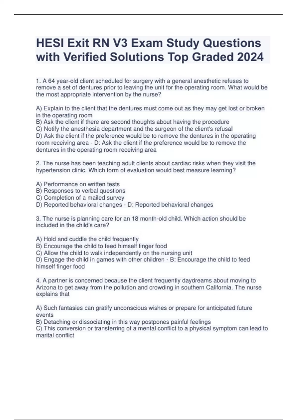 1. A 64 year-old client scheduled for surgery with a general anesthetic refuses to remove a set of dentures prior to leaving the unit for the operating room. What would be the most appropriate intervention by the nurse? A) Explain to the client that the dentures must come out as they may get lost or broken in the operating room B) Ask the client if there are second thoughts about having the procedure C) Notify the anesthesia department and the surgeon of the client's refusal D) Ask the client if the preference would be to remove the dentures in the operating room receiving area - D: Ask the client if the preference would be to remove the dentures in the operating room receiving area 2. The nurse has been teaching adult clients about cardiac risks when they visit the hypertension clinic. Which form of evaluation would best measure learning? A) Performance on written tests B) Responses to verbal questions C) Completion of a mailed survey D) Reported behavioral changes - D: Reported behavioral changes 3. The nurse is planning care for an 18 month-old child. Which action should be included in the child's care? A) Hold and cuddle the child frequently B) Encourage the child to feed himself finger food C) Allow the child to walk independently on the nursing unit D) Engage the child in games with other children - B: Encourage the child to feed himself finger food 4. A partner is concerned because the client frequently daydreams about moving to Arizona to get away from the pollution and crowding in southern California. The nurse explains that A) Such fantasies can gratify unconscious wishes or prepare for anticipated future events B) Detaching or dissociating in this way postpones painful feelings C) This conversion or transferring of a mental conflict to a physical symptom can lead to marital conflict D) To isolate the feelings in this way reduces conflict within the client and with others - A: Such fantasies can gratify unconscious wishes or prepare for anticipated future events 5. An appropriate goal for a client with anxiety would be to A) Ventilate anxious feelings to the nurse B) Establish contact with reality C) Learn self-help techniques D) Become desensitized to past trauma - C: Learn self-help techniques 6. While the nurse is administering medications to a client, the client states "I do not want to take that medicine today." Which of the following responses by the nurse would be best? A) "That's OK, its all right to skip your medication now and then." B) "I will have to call your doctor and report this." C) "Is there a reason why you don't want to take your medicine?" D) "Do you understand the consequences of refusing your prescribed treatment?" - C: "Is there a reason why you don't want to take your medicine?" 7. While caring for a client, the nurse notes a pulsating mass in the client's peri umbilical area. Which of the following assessments is appropriate for the nurse to perform? A) Measure the length of the mass B) Auscultate the mass C) Percuss the mass D) Palpate the mass - B: Auscultate the mass 8. A client is admitted to the hospital with a history of confusion. The client has difficulty remembering recent events and becomes disoriented when away from home. Which statement would provide the best reality orientation for this client? A) "Good morning. Do you remember where you are?" B) "Hello. My name is Elaine Jones and I am your nurse for today." C) "How are you today? Remember, you're in the hospital." D) "Good morning. You're in the hospital. I am your nurse Elaine Jones." - D: "Good morning. You're in the hospital. I am your nurse Elaine Jones." 9. The nurse is teaching the parents of a 3 month-old infant about nutrition. What is the main source of fluids for an infant until about 12 months of age? A) Formula or breast milk B) Dilute nonfat dry milk C) Warmed fruit juice D) Fluoridated tap water - A: Formula or breast milk
