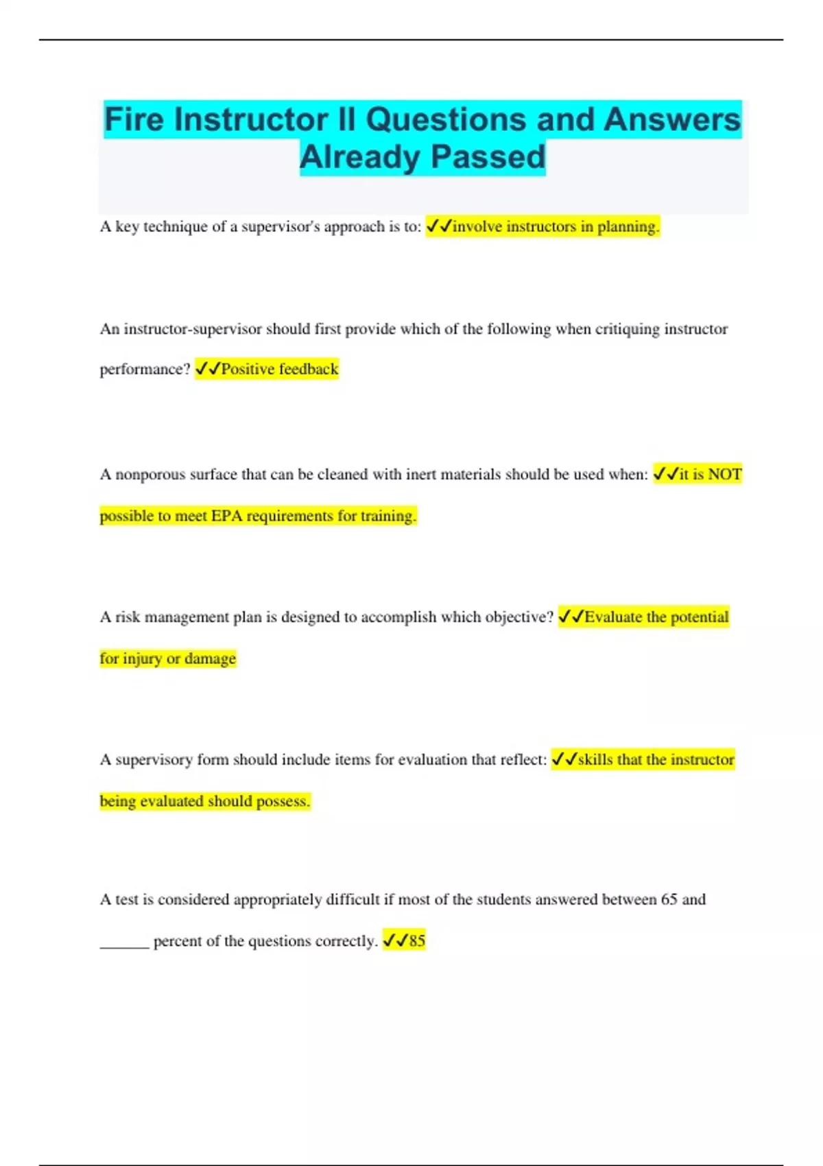 Fire Instructor II Questions and Answers 100% Pass Among adult learners, habits NOT reinforced are weakened through: disuse What is the 1st step an instructor takes to create a lesson plan? determine the learning objectives The best way for an instructo to avoid bias in instructional materials is to: adhere very closely to the source material that is being taught Which term describes the knowledge or skills that students should have acquired by the conclusion of a lesson? learning objectives The ________ in the cognition domain follow an ordered progression or hierarchy of instructional outcomes. levels of learning Action verbs are usually included to define the activity in a ________ learning objective. psychomotor Learning objectives are difficult to measure in the ________ domain. affecitve The 1st step of research an instructor would use to develop lesson plans & training courses is to: identify the topic that is to be researched A level II instructor's personal knowledge is an acceptable starting point when looking for: expert opinion information While credible information will be available to the level II instructor, instructors are encouraged to: scrutinize all sources closely Whcih of the following are used in research papers, books, articles & electronic media to indicate the source of quotes or other information that is not original to the writer? citations After establishing learning objectives, what is the next step in the lesson planning process? development of a lesson outline When including group discussions in a lesson plan, knowing what students should understand after completing the discussion is referred to as: defining the purpose Supplementary materials such as handouts, study guides or skill sheets are referred to as: ancillary components When a level II instructor illustrates a process through the use of artwork, photography or cutaway models, they have selected to enhance the lesson plan: technology tools The only difference in teaching from a newly created lesson plan & teaching from a previously prepared lesson plan is: there may be items in a new lesson that appear to be effective on paper but don't meet expectations in practice, Which law of learning indicates that a person is emotionally, mentally & physically prepared to learn new knowledge or skills? readiness Which learning principle assumes adults learn best when they can practice a skill? exercise Which learning principle reinforces how the information is useful to the student? effect Training programs should force students to repeat skills at regular intervals because habits not reinforced are weakened through: disuse Which learning principle says that instructors should consider what students know & then connect it to the material they need to learn? association The learning principle that states skills & information practiced or learned most recently are also the best remembered is: recency Which learning principle assumes that the 1st of a series of learned acts will be remembered better than others? primacy Which principle of learning states that if a stimulus (experience) is vivid & real, it will more likely change or have an effect on the behavior (learning)? intensity Determining the learning outcomes is the ________ step in creating a lesson plan. first
