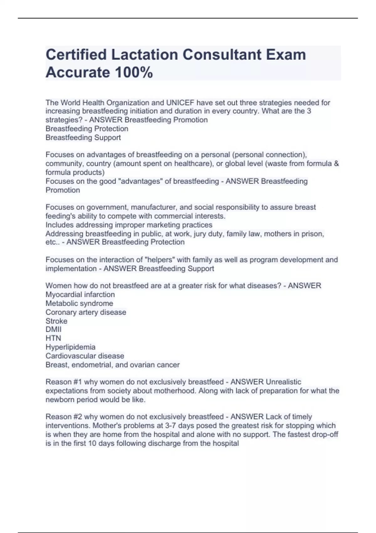 The World Health Organization and UNICEF have set out three strategies needed for increasing breastfeeding initiation and duration in every country. What are the 3 strategies? - ANSWER Breastfeeding Promotion Breastfeeding Protection Breastfeeding Support Focuses on advantages of breastfeeding on a personal (personal connection), community, country (amount spent on healthcare), or global level (waste from formula & formula products) Focuses on the good "advantages" of breastfeeding - ANSWER Breastfeeding Promotion Focuses on government, manufacturer, and social responsibility to assure breast feeding's ability to compete with commercial interests. Includes addressing improper marketing practices Addressing breastfeeding in public, at work, jury duty, family law, mothers in prison, etc.. - ANSWER Breastfeeding Protection Focuses on the interaction of "helpers" with family as well as program development and implementation - ANSWER Breastfeeding Support Women how do not breastfeed are at a greater risk for what diseases? - ANSWER Myocardial infarction Metabolic syndrome Coronary artery disease Stroke DMII HTN Hyperlipidemia Cardiovascular disease Breast, endometrial, and ovarian cancer Reason #1 why women do not exclusively breastfeed - ANSWER Unrealistic expectations from society about motherhood. Along with lack of preparation for what the newborn period would be like. Reason #2 why women do not exclusively breastfeed - ANSWER Lack of timely interventions. Mother's problems at 3-7 days posed the greatest risk for stopping which is when they are home from the hospital and alone with no support. The fastest drop-off is in the first 10 days following discharge from the hospital