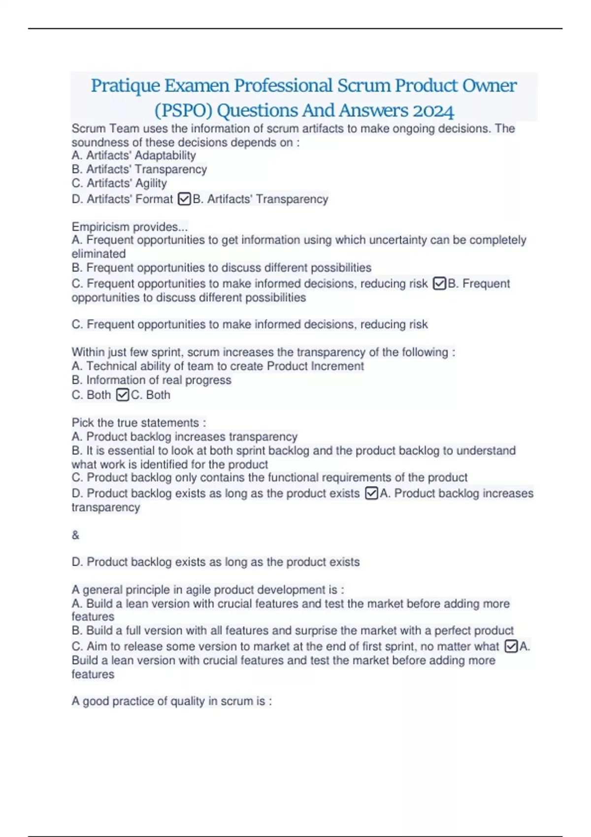 Pratique Examen Professional Scrum Product Owner (PSPO) Questions And Answers 2024 Pratique Examen Professional Scrum Product Owner (PSPO) Questions And Answers 2024