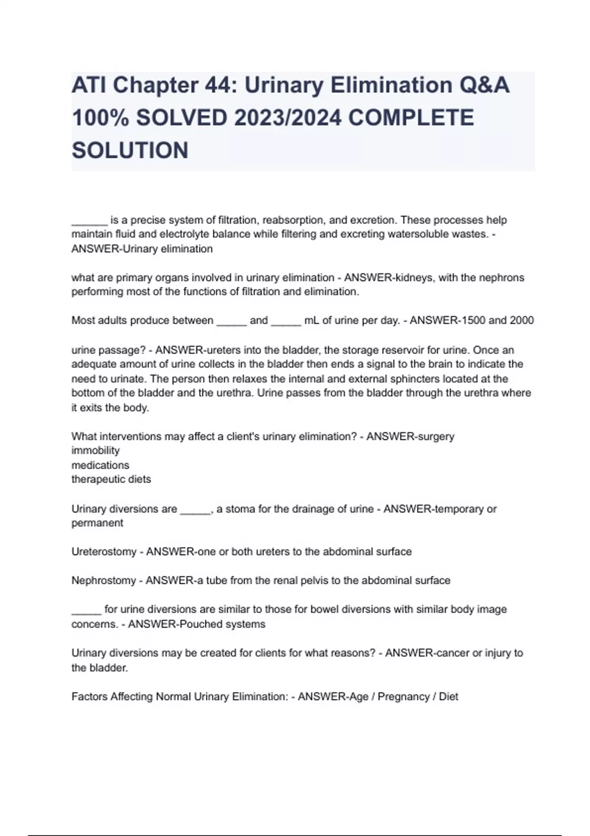 - ATI Chapter 44: Urinary Elimination Q&A 100% SOLVE