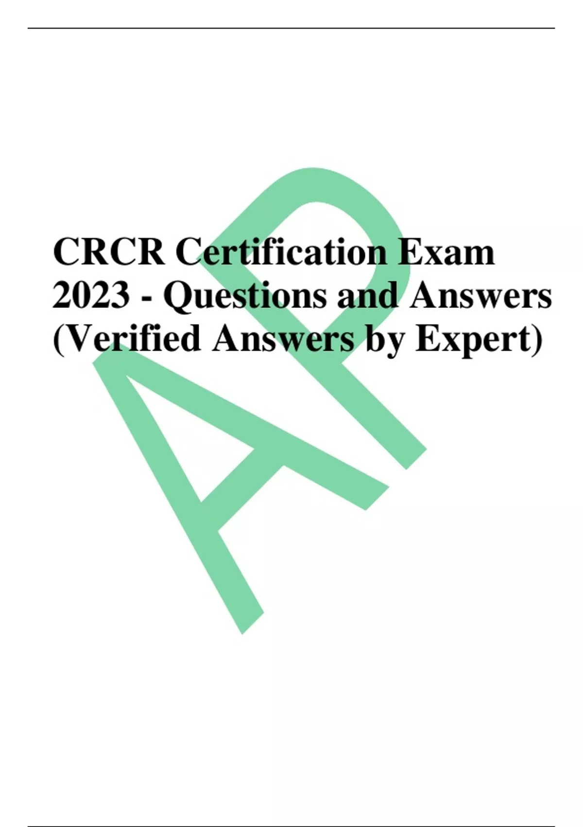 CRCR Certification Exam 2023 Questions and Answers (Verified Answers by Expert) 1. Overall aggregate payments made to a hospice are subject to a computed "cap amount" calculated by The Medicare Administrative Contractor (MAC) at the end of the hospice cap period 2. Which of the following is required for participation in Medicaid Meet In- come and Assets Requirements 3. In choosing a setting for patient financial discussions, organizations should first and foremost Respect the patients privacy 4. A nightly room charge will be incorrect if the patient's Trfer from ICU (intensive care unit) to the Medical/Surgical floor is not reflected in the registration system 5. The Affordable Care Act legislated the development of Health Insurance Exchanges, where individuals and small businesses can Purchase 1 / 15 qualified health benefit pl regardless of insured's health status 6. A portion of the accounts receivable inventory which has NOT qualified for billing includes Charitable pledges 7. What is required for the UB-04/837-I, used by Rural Health Clinics to generate payment from Medicare? Revenue codes 8. This directive was developed to promote and ensure healthcare quality and value and also to protect consumers and workers in the healthcare system. This directive is called Patient bill of rights 9. The activity which results in the accurate recording of patient bed and level of care assessment, patient trfer and patient discharge status on a real-time basis is known as Case management 10. Which statement is an EMTALA (Emergency Medical Treatment and Active Labor Act) violation? Registration staff may routinely contact managed are pl for prior authorizations before the patient is seen by the onduty physician 2 / 1