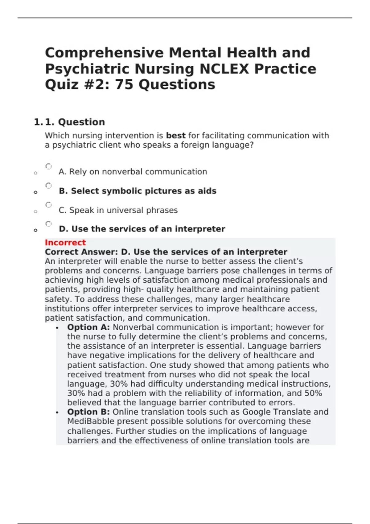 Comprehensive Mental Health and Psychiatric Nursing NCLEX Practice Quiz #2: 75 Questions