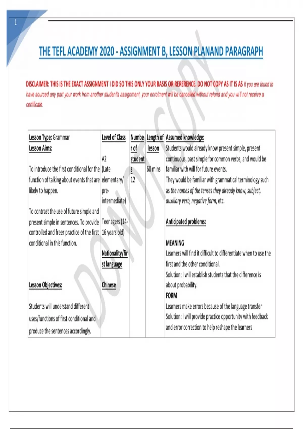 THE TEFL ACADEMY 2020 - ASSIGNMENT B, LESSON PLAN AND PARAGRAPH.