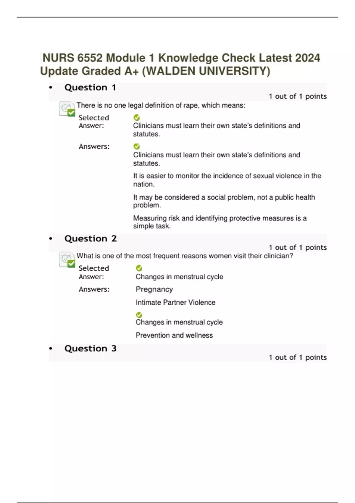 NURS 6552 Module 1 Knowledge Check Latest 2024 Update Graded A+ (WALDEN UNIVERSITY) There is no one legal definition of rape, which means: What is one of the most frequent reasons women visit their clinician?