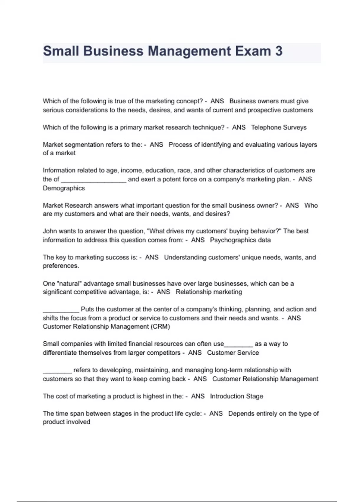 Small Business Management Exam 3 Questions And Answers Which of the following is true of the marketing concept? - ANS Business owners must give serious considerations to the needs, desires, and wants of current and prospective customers Which of the following is a primary market research technique? - ANS Telephone Surveys Market segmentation refers to the: - ANS Process of identifying and evaluating various layers of a market Information related to age, income, education, race, and other characteristics of customers are the of __________________ and exert a potent force on a company's marketing plan. - ANS Demographics Market Research answers what important question for the small business owner? - ANS Who are my customers and what are their needs, wants, and desires? John wants to answer the question, "What drives my customers' buying behavior?" The best information to address this question comes from: - ANS Psychographics data The key to marketing success is: - ANS Understanding customers' unique needs, wants, and preferences. One "natural" advantage small businesses have over large businesses, which can be a significant competitive advantage, is: - ANS Relationship marketing __________ Puts the customer at the center of a company's thinking, planning, and action and shifts the focus from a product or service to customers and their needs and wants. - ANS Customer Relationship Management (CRM) Small companies with limited financial resources can often use________ as a way to differentiate themselves from larger competitors - ANS Customer Service ________ refers to developing, maintaining, and managing long-term relationship with customers so that they want to keep coming back - ANS Customer Relationship Management The cost of marketing a product is highest in the: - ANS Introduction Stage The time span between stages in the product life cycle: - ANS Depends entirely on the type of product involved The most common channel of distribution for consumer goods is: - ANS Manufacturer --> Wholesaler ---> Retailer ---> Consumer Low cost but highly effective marketing is also known as: - ANS Guerrilla Marketing One of the first steps in building a marketing plan is identifying a small company's __________, the group of customers at whom the company aims its products and services - ANS target market Surveys, questionnaires, and focus groups are considered to be: - ANS Primary Research The most meaningful unique selling proposition: - ANS Describes the primary benefit of the product