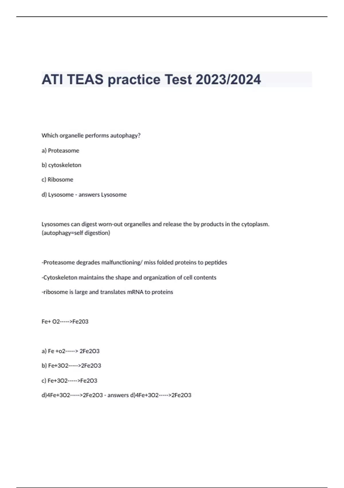 Which organelle performs autophagy? a) Proteasome b) cytoskeleton c) Ribosome d) Lysosome - answers Lysosome Lysosomes can digest worn-out organelles and release the by products in the cytoplasm. (autophagy=self digestion) -Proteasome degrades malfunctioning/ miss folded proteins to peptides -Cytoskeleton maintains the shape and organization of cell contents -ribosome is large and translates mRNA to proteins Fe+ O2----->Fe203 a) Fe +o2-----> 2Fe2O3 b) Fe+3O2----->2Fe2O3 c) Fe+3O2----->Fe2O3 d)4Fe+3O2----->2Fe2O3 - answers d)4Fe+3O2----->2Fe2O3 The reaction above is the oxidation of Iron. You need to balance the equation Which of the following is carried out by the Luteinizing Hormone (LH) a) Protection of pregnancy b)Ovulation c)Menstruation d) Labor - answers B) Ovulation An acute rise of LH from the anterior pituitary gland, causes ovulation -progesterone causes pregnancy -decreased progesterone causes menstruation -Oxytocin is secreted during labor Which of the following is spelled incorrectly? a)neumonia b)pnumonia c) numonia d) pneumonia - answers d) pneumonia