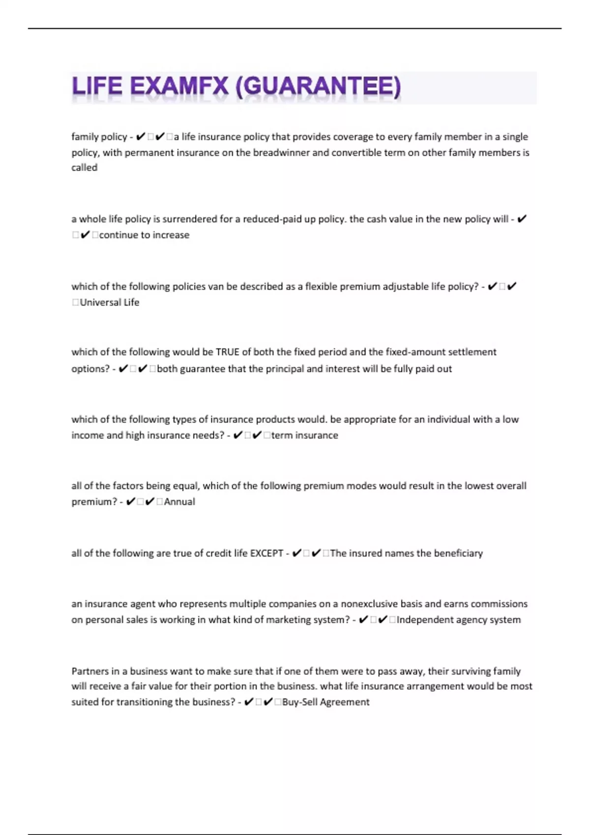 family policy - ️️a life insurance policy that provides coverage to every family member in a single policy, with permanent insurance on the breadwinner and convertible term on other family members is called a whole life policy is surrendered for a reduced-paid up policy. the cash value in the new policy will - ️️continue to increase which of the following policies van be described as a flexible premium adjustable life policy? - ️️Universal Life which of the following would be TRUE of both the fixed period and the fixed-amount settlement options? - ️️both guarantee that the principal and interest will be fully paid out which of the following types of insurance products would. be appropriate for an individual with a low income and high insurance needs? - ️️term insurance all of the factors being equal, which of the following premium modes would result in the lowest overall premium? - ️️Annual all of the following are true of credit life EXCEPT - ️️The insured names the beneficiary an insurance agent who represents multiple companies on a nonexclusive basis and earns commissions on personal sales is working in what kind of marketing system? - ️️Independent agency system Partners in a business want to make sure that if one of them were to pass away, their surviving family will receive a fair value for their portion in the business. what life insurance arrangement would be most suited for transitioning the business? - ️️Buy-Sell Agreement