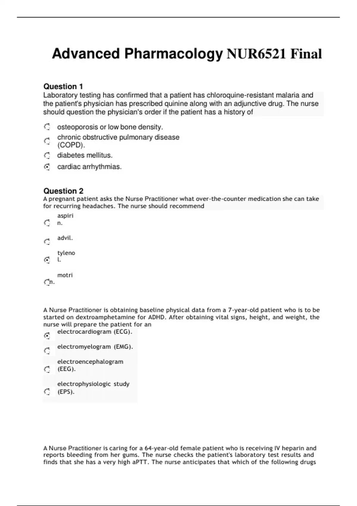 Laboratory testing has confirmed that a patient has chloroquine-resistant malaria and the patient's physician has prescribed quinine along with an adjunctive drug. The nurse should question the physician's order if the patient has a history of osteoporosis or low bone density. chronic obstructive pulmonary disease (COPD). diabetes mellitus. cardiac arrhythmias. Question 2 A pregnant patient asks the Nurse Practitioner what over-the-counter medication she can take for recurring headaches. The nurse should recommend aspiri n. advil. tyleno l. motri n. A Nurse Practitioner is obtaining baseline physical data from a 7-year-old patient who is to be started on dextroamphetamine for ADHD. After obtaining vital signs, height, and weight, the nurse will prepare the patient for an electrocardiogram (ECG). electromyelogram (EMG). electroencephalogram (EEG). electrophysiologic study (EPS). A Nurse Practitioner is caring for a 64-year-old female patient who is receiving IV heparin and reports bleeding from her gums. The nurse checks the patient's laboratory test results and finds that she has a very high aPTT. The nurse anticipates that which of the following drugs may be ordered?