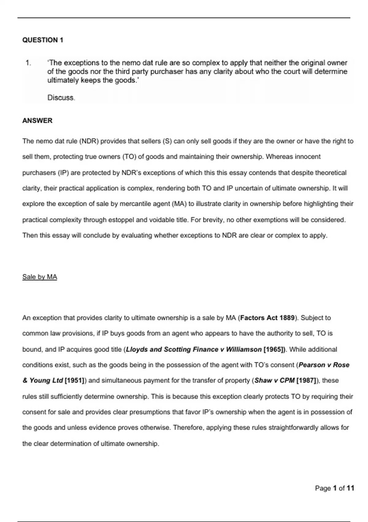 Commercial Law Exam with two essays - one on the nemo demo dat rules and another on section 18 of the Sale of Goods Act (SGA) - and also a problem question on various principles under the SGA. The grades and feedback for each question are at the end of the document.