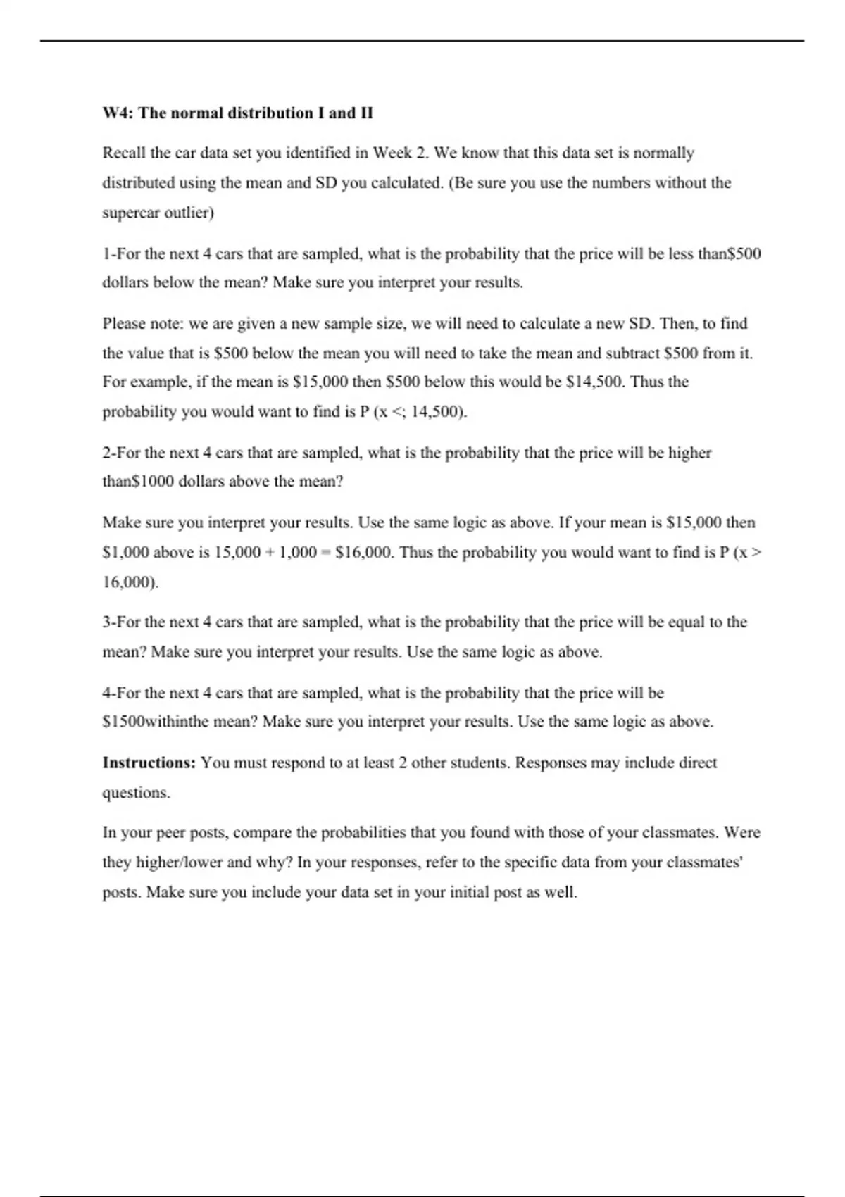 W4: The normal distribution I and II Recall the car data set you identified in Week 2. We know that this data set is normally distributed using the mean and SD you calculated. (Be sure you use the numbers without the supercar outlier) .....................