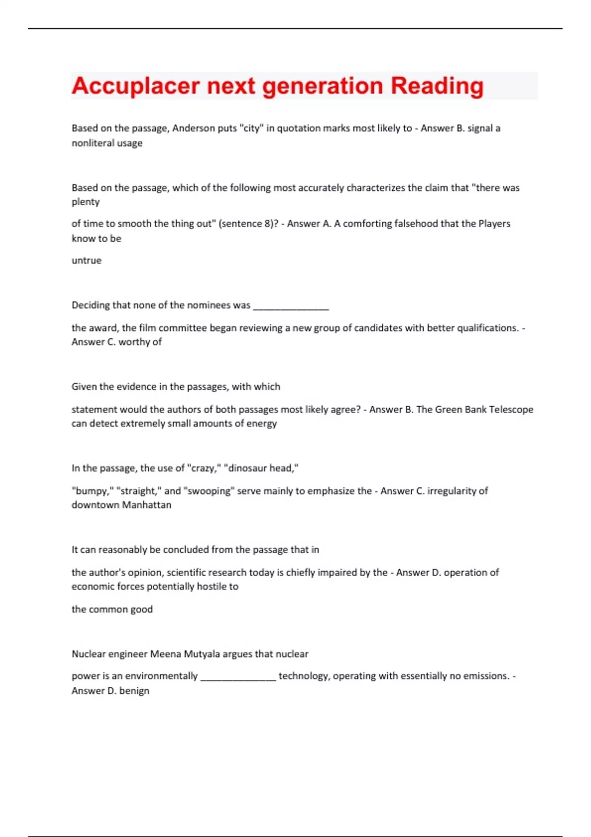 Accuplacer next generation Reading All Possible Questions and Answers with complete solution