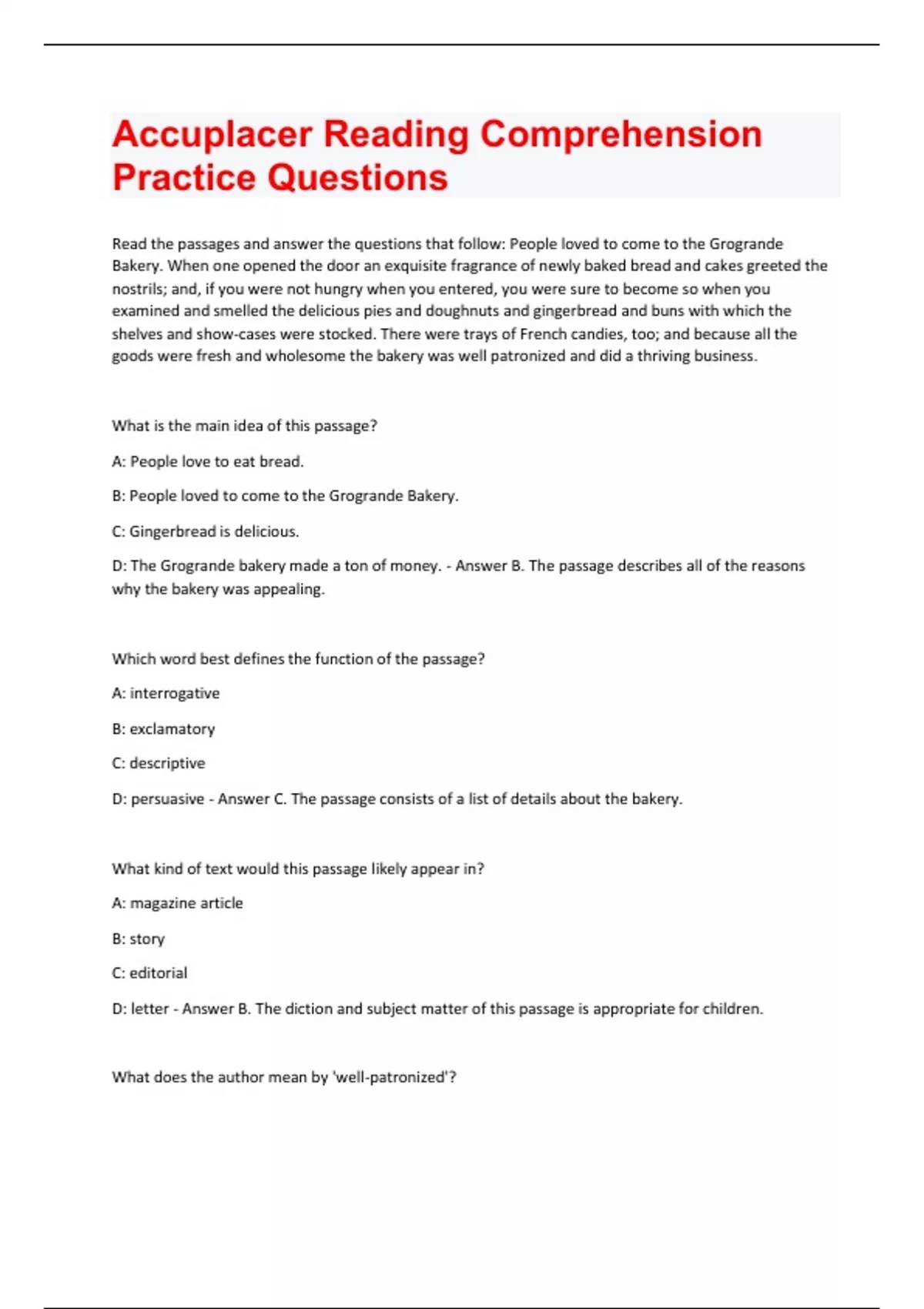 Accuplacer Reading Comprehension Practice Questions With 100% Correct Answers.