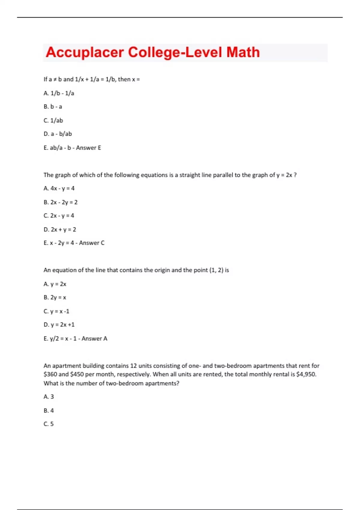 If a ≠ b and 1/x + 1/a = 1/b, then x = A. 1/b - 1/a B. b - a C. 1/ab D. a - b/ab E. ab/a - b - Answer E The graph of which of the following equations is a straight line parallel to the graph of y = 2x ? A. 4x - y = 4 B. 2x - 2y = 2 C. 2x - y = 4 D. 2x + y = 2 E. x - 2y = 4 - Answer C An equation of the line that contains the origin and the point (1, 2) is A. y = 2x B. 2y = x C. y = x -1 D. y = 2x +1 E. y/2 = x - 1 - Answer A An apartment building contains 12 units consisting of one- and two-bedroom apartments that rent for $360 and $450 per month, respectively. When all units are rented, the total monthly rental is $4,950. What is the number of two-bedroom apartments? A. 3 B. 4 C. 5D. 6 E. 7 - Answer E If θ is an acute angle and sin θ = 1/2, then cos θ = A. -1 B. 0 C. 1/2 D. √3/2 E. 2 - Answer D 5y(2y - 3) + (2y - 3) = A. (5y + 1) (2y + 3) B. (5y + 1) (2y - 3) C. (5y - 1) (2y + 3) D. (5y -1) (2y - 3) E. 10y (2y - 3) - Answer B One ordering of the letters T, U, V and W from left to right is UTVW. What is the total number of orderings of these letters from left to right, including UTVW? A. 8 B. 12 C. 16 D. 20 E. 24 - Answer E