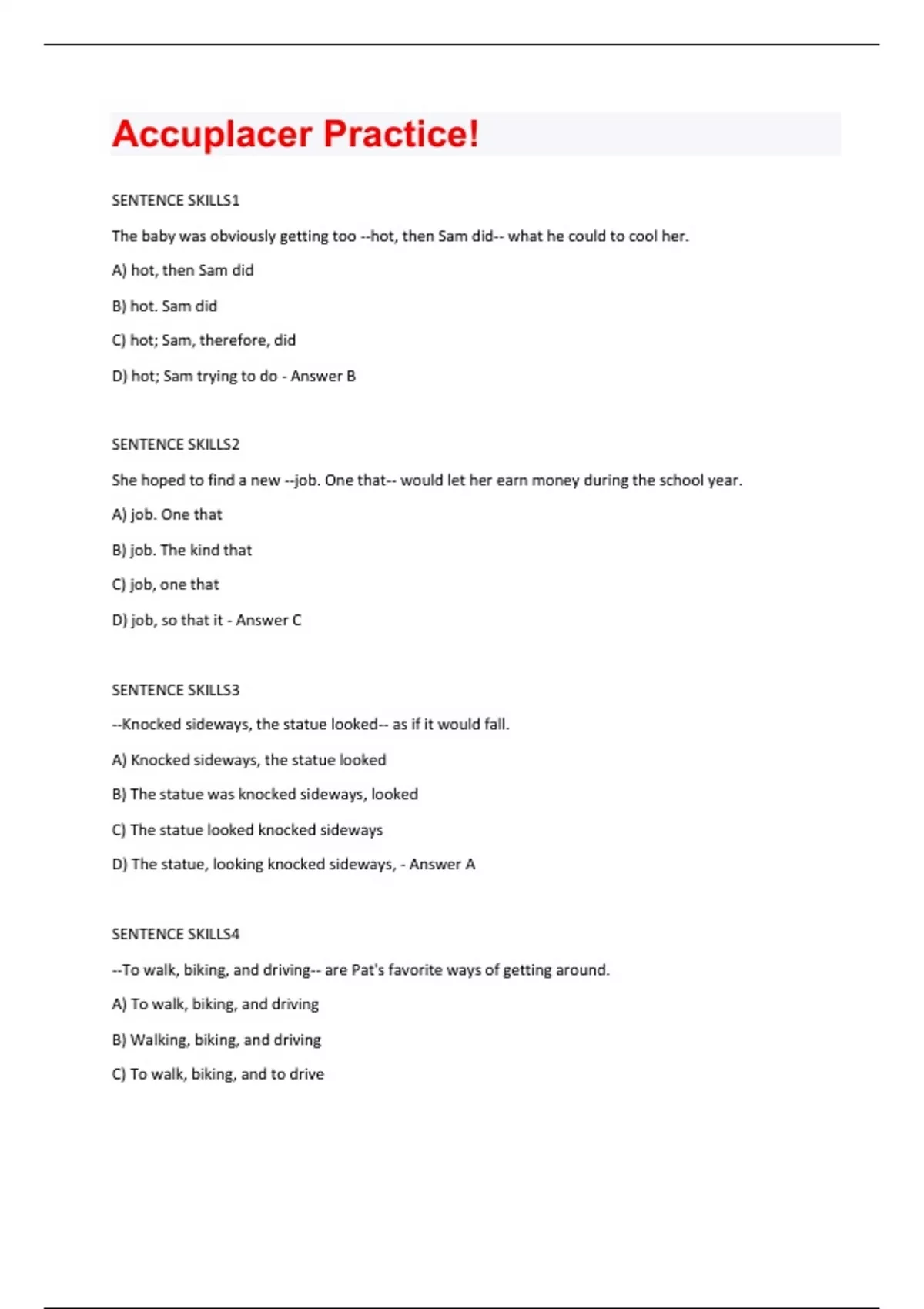 SENTENCE SKILLS1 The baby was obviously getting too --hot, then Sam did-- what he could to cool her. A) hot, then Sam did B) hot. Sam did C) hot; Sam, therefore, did D) hot; Sam trying to do - Answer B SENTENCE SKILLS2 She hoped to find a new --job. One that-- would let her earn money during the school year. A) job. One that B) job. The kind that C) job, one that D) job, so that it - Answer C SENTENCE SKILLS3 --Knocked sideways, the statue looked-- as if it would fall. A) Knocked sideways, the statue looked B) The statue was knocked sideways, looked C) The statue looked knocked sideways D) The statue, looking knocked sideways, - Answer A SENTENCE SKILLS4 --To walk, biking, and driving-- are Pat's favorite ways of getting around. A) To walk, biking, and driving B) Walking, biking, and driving C) To walk, biking, and to driveD) To walk, to bike, and also driving - Answer B SENTENCE SKILLS5 --When you cross the street in the midle of the block, this-- is an example of jaywalking. A) When you cross the street in the middle of the block, this B) You cross the street in the middle of the block, this C) Crossing the street in the middle of the block D) The fact that you cross the street in the middle of the block - Answer C SENTENCE SKILLS6 Walking by the corner the other day, --a child, I noticed, was watching-- for the light to change. A) a child, I noticed, was B) I noticed a child watching C) a child was watching, I noticed, D) there was, I noticed, a child watching - Answer B SENTENCE SKILLS7 In his songs, Gordon Lightfoot makes melody and lyrics intricately intertwine. Rewrite, beginning with --Melody and lyrics-- Your new sentence will include A) Gordon Lightfoot has B) make Gordon Lightfoot's C) in Gordon Lightfoot's D) does Gordon Lightfood - Answer C