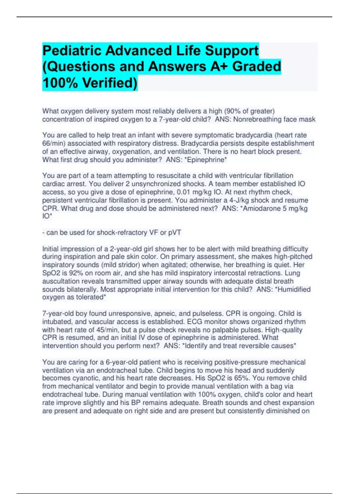 Pediatric Advanced Life Support (Questions and Answers A+ Graded 100% Verified)