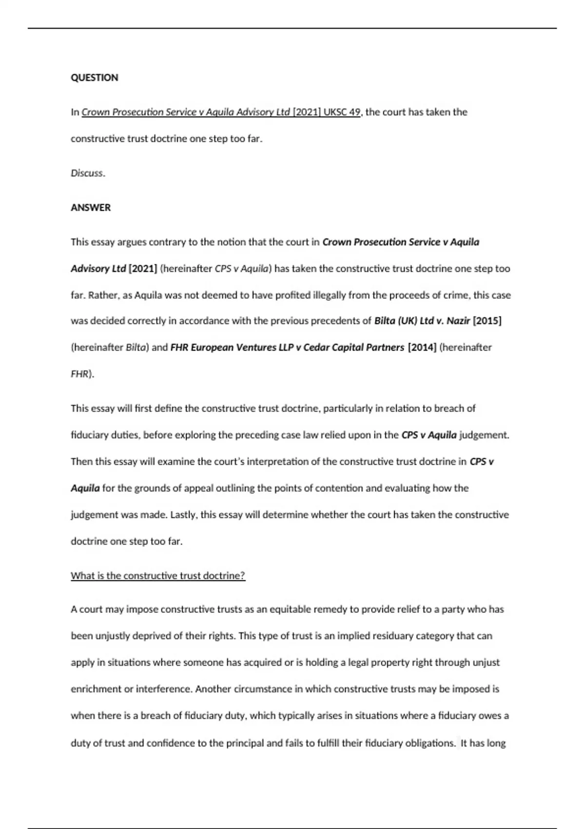 Then this essay will examine the court’s interpretation of the constructive trust doctrine in CPS v