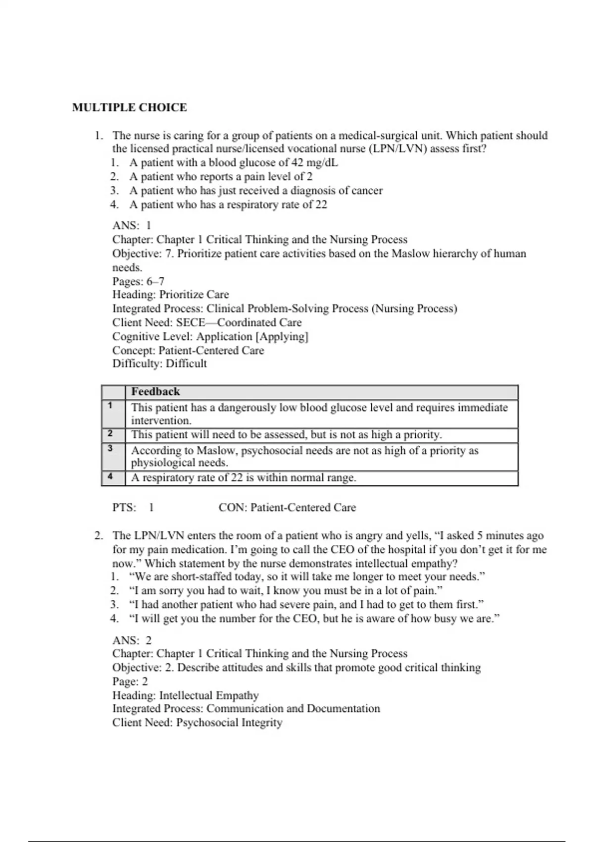 1. The nurse is caring for a group of patients on a medical-surgical unit. Which patient should the licensed practical nurse/licensed vocational nurse (LPN/LVN) assess first? 1. A patient with a blood glucose of 42 mg/dL 2. A patient who reports a pain level of 2 3. A patient who has just received a diagnosis of cancer 4. A patient who has a respiratory rate of 22 ANS: 1 Chapter: Chapter 1 Critical Thinking and the Nursing Process Objective: 7. Prioritize patient care activities based on the Maslow hierarchy of human needs. Pages: 6–7 Heading: Prioritize Care Integrated Process: Clinical Problem-Solving Process (Nursing Process) Client Need: SECE—Coordinated Care Cognitive Level: Application [Applying] Concept: Patient-Centered Care Difficulty: Difficult Feedback 1 This patient has a dangerously low blood glucose level and requires immediate intervention. 2 This patient will need to be assessed, but is not as high a priority. 3 According to Maslow, psychosocial needs are not as high of a priority as physiological needs. 4 A respiratory rate of 22 is within normal range. PTS: 1 CON: Patient-Centered Care 2. The LPN/LVN enters the room of a patient who is angry and yells, “I asked 5 minutes ago for my pain medication. I’m going to call the CEO of the hospital if you don’t get it for me now.” Which statement by the nurse demonstrates intellectual empathy? 1. “We are short-staffed today, so it will take me longer to meet your needs.” 2. “I am sorry you had to wait, I know you must be in a lot of pain.” 3. “I had another patient who had severe pain, and I had to get to them first.” 4. “I will get you the number for the CEO, but he is aware of how busy we are.” ANS: 2 Chapter: Chapter 1 Critical Thinking and the Nursing Process Objective: 2. Describe attitudes and skills that promote good critical thinking Page: 2 Heading: Intellectual Empathy Integrated Process: Communication and Documentation Client Need: Psychosocial Integrity Cognitive Level: Application [Applying] Concept: Communication Difficulty: Moderate Feedback 1 This statement does not consider an individual’s situation. 2 This statement demonstrates intellectual empathy by considering this patient’s situation and will likely alleviate the patient’s anger. 3 This statement does not consider a patient’s situation and does not demonstrate intellectual empathy. 4 This statement addresses the patient’s statement of wanting to call the CEO, but does not demonstrate intellectual empathy by considering the patient’s situation. PTS: 1 CON: Communication 3. The nurse is collecting data on a patient. Which data are described as subjective? 1. Respiratory rate of 26 per minute 2. Patient report of shortness of breath 3. Coarse lung sounds bilaterally 4. Cough producing green sputum ANS: 2 Chapter: Chapter 1 Critical Thinking and the Nursing Process Objective: 5. Differentiate between objective and subjective data. Page: 4 Heading: Subjective Data Integrated Process: Communication and Documentation Client Need: Communication and Documentation Cognitive Level: Application (Applying) Concept: Communication Difficulty: Moderate Feedback 1 Respiratory rate of 26 per minute is an example of objective data. 2 A patient reporting symptoms to the nurse is an example of subjective data. 3 Coarse lung sounds is an example of objective data. 4 A productive cough is an example of objective data. PTS: 1 CON: Communication 4. A patient with a newly fractured femur reports a pain level of 8/10 and analgesic medication is not due for another 50 minutes. Which action should the nurse take first? 1. Reposition the patient. 2. Give the medication in 30 minutes. 3. Notify the registered nurse (RN) or physician. 4. Tell the patient it is too early for pain medication. ANS: 3 Chapter: Chapter 1 Critical Thinking and the Nursing Process Objective: 4. Identify the role of a licensed practical nurse/licensed vocational nurse in using the nursing process. Page: 3 Heading: Clinical Judgement Integrated Process: Clinical Problem-solving Process (Nursing Process) Client Need: SECE—Coordinated Care Cognitive Level: Application [Applying] Concept: Patient-Centered Care Difficulty: Moderate Feedback 1 The patient who has a fractured femur is having acute pain. Repositioning a patient with a new fracture is not likely to relieve pain. 2 Giving the medication before the prescribed time is beyond the nurse’s scope of practice. 3 The patient should not have to wait for pain relief, so the LPN should inform the RN or physician so new pain relief orders can be obtained. 4 The nurse needs to do more than expect the patient to wait for pain relief. PTS: 1 CON: Patient-Centered Care 5. The nurse is prioritizing care based on Maslow hierarchy of needs. Which need does the nurse identify as having the highest priority? 1. Job-related stress 2. Feeling of loneliness 3. Pain level of 9 on 0-to-10 scale 4. Lack of confidence ANS: 3 Chapter: Chapter 1 Critical Thinking and the Nursing Process Objective: 7. Prioritize patient care activities based on the Maslow hierarchy of human needs Page: 7 Heading: Prioritize Care Integrated Process: Caring Client Need: SECE – Coordinated Care Cognitive Level: Application [Applying] Concept: Patient-Centered Care Difficulty: Moderate Feedback 1 Job-related stress falls under safety according to Maslow and is addressed after physiological needs. 2 According to Maslow, loneliness is addressed under social needs following physiological and safety. 3 Pain is a physiological need and is the highest priority. NUCLEX EXAM TEST BANK QUESTIONS MULTIPLE CHOICE QUESTIONS WITH ANSWERS LATEST UPDATED 2023 STUDY GUIDE NUCLEX EXAM TEST BANK QUESTIONS MULTIPLE CHOICE QUESTIONS WITH ANSWERS LATEST UPDATED 2023 STUDY GUIDE 4 Lack of confidence falls under esteem according to Maslow and is addressed following physiological, safety, and social needs. NUCLEX EXAM TEST BANK QUESTIONS MULTIPLE CHOICE QUESTIONS WITH ANSWERS LATEST U