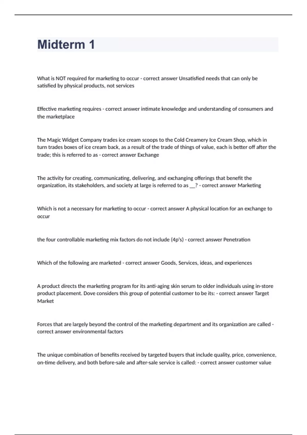 Midterm 1 Question and answers correctly solved 2023/2024 What is NOT required for marketing to occur - correct answer Unsatisfied needs that can only be satisfied by physical products, not services Effective marketing requires - correct answer intimate knowledge and understanding of consumers and the marketplace The Magic Widget Company trades ice cream scoops to the Cold Creamery Ice Cream Shop, which in turn trades boxes of ice cream back, as a result of the trade of things of value, each is better off after the trade; this is referred to as - correct answer Exchange The activity for creating,
