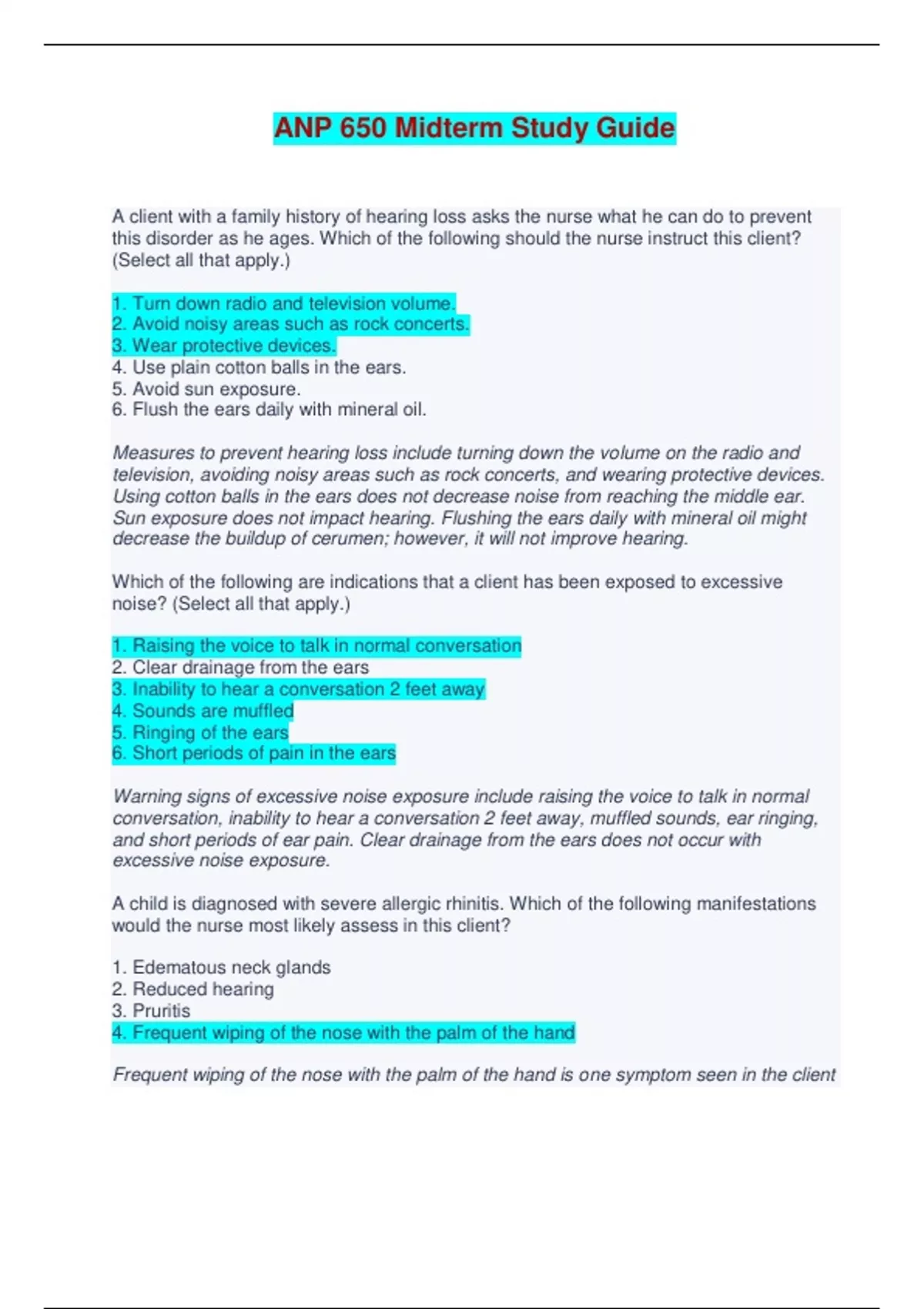 ANP 650 Midterm Study Guide - Questions, Answers and Rationales A client with a family history of hearing loss asks the nurse what he can do to prevent this disorder as he ages. Which of the following should the nurse instruct this client? (Select all that apply.) 1. Turn down radio and television volume. 2. Avoid noisy areas such as rock concerts. 3. Wear protective devices. 4. Use plain cotton balls in the ears. 5. Avoid sun exposure. 6. Flush the ears daily with mineral oil. Measures to prevent hearing loss include turning down the volume on the radio and television, avoiding noisy areas such as rock concerts, and wearing protective devices. Using cotton balls in the ears does not decrease noise from reaching the middle ear. Sun exposure does not impact hearing. Flushing the ears daily with mineral oil might decrease the buildup of cerumen; however, it will not improve hearing. Which of the following are indications that a client has been exposed to excessive noise? (Select all that apply.) 1. Raising the voice to talk in normal conversation 2. Clear drainage from the ears 3. Inability to hear a conversation 2 feet away 4. Sounds are muffled 5. Ringing of the ears 6. Short periods of pain in the ears Warning signs of excessive noise exposure include raising the voice to talk in normal conversation, inability to hear a conversation 2 feet away, muffled sounds, ear ringing, and short periods of ear pain. Clear drainage from the ears does not occur with excessive noise exposure. A child is diagnosed with severe allergic rhinitis. Which of the following manifestations would the nurse most likely assess in this client? 1. Edematous neck glands 2. Reduced hearing 3. Pruritis 4. Frequent wiping of the nose with the palm of the hand Frequent wiping of the nose with the palm of the hand is one symptom seen in the client diagnosed with severe allergic rhinitis. Edematous neck glands, reduced hearing, and pruritis are not manifestations of severe allergic rhinitis. A client tells the nurse that she experiences a stuffy nose, nasal pain, and postnasal drip every time she works in her company’s office. Which of the following types of allergic rhinitis is this client most likely experiencing? 1. Infectious 2. Perennial 3. Occupational 4. Seasonal Occupational allergic rhinitis occurs from airborne substances in the workplace. Seasonal allergic rhinitis occurs during a specific time of the year. Perennial allergic rhinitis occurs in response to exposure to environmental allergens that can occur throughout the year. Infectious rhinitis is a nonallergic type of rhinitis. A client asks the nurse if there is an antihistamine that does not cause drowsiness. Which of the following medications would this client most likely prefer to treat allergic rhinitis? 1. Diphenhydramine 2. Chlorpheniramine maleate 3. Clemastine 4. Fexofenadine Fexofenadine (Allegra) is a second-generation antihistamine, and second-generation antihistamines exhibit less sedation than first-generation medications such as diphenhydramine, chlorpheniramine maleate, and clemastine. A client diagnosed with hypertension is experiencing allergic rhinitis. The nurse realizes that the medication that would not be indicated for this client would be: 1. loratadine. 2. montelukast. 3. pseudoephedrine. 4. zafirlukast. Pseudoephedrine can be contraindicated for the patient with hypertension. Loratadine, montelukast, and zafirlukast should be used cautiously for patients with hepatic impairment. A 16-year-old client is being prescribed a medication to treat acute sinusitis. The nurse realizes that this client should not be prescribed: 1. amoxicillin. 2. cefuroxime. 3. ciprofloxacin. 4. erythromycin. Quinolones such as ciprofloxacin (Cipro) and levofloxacin (Levaquin) are contraindicated in children younger than 17 years of age. The nurse is caring for a client diagnosed with acute sinusitis. Which of the following symptoms is the client most likely experiencing? 1. Anosmia 2. Fever 3. Halitosis 4. Metallic taste Clients often complain of unilateral face pain, purulent nasal discharge, pain during mastication, anosmia (absence of smell), and headache. Less common symptoms include fever, nasal congestion, halitosis, toothache, metallic taste, and cough. The nurse is planning care for the client diagnosed with viral rhinitis. Which of the following would be the best goal of care for this client? 1. Prevent secondary bacterial infection. 2. Prevent rhinitis medicamentosa. 3. Refrain from use of analgesics. 4. Encourage complete participation in activities. Treatment of acute rhinitis, or the common cold, is aimed at decreasing the impact of the symptoms and preventing secondary bacterial infection. Rhinitis medicamentosa occurs from misuse of nasal decongestants. Acetaminophen or a nonsteroidal anti-inflammatory agent is useful for fever, aches, and pain. Rest is encouraged. The nurse is instructing the mother of a client recovering from a tonsillectomy. Which of the following should the nurse instruct the mother to report? 1. Difficulty swallowing 2. Difficulty talking 3. Excessive swallowing 4. Pain Excessive swallowing is a sign of bleeding and should be reported. Pain and difficulty talking and swallowing are expected. Which of the following should the nurse instruct a client recovering from a tonsillectomy?