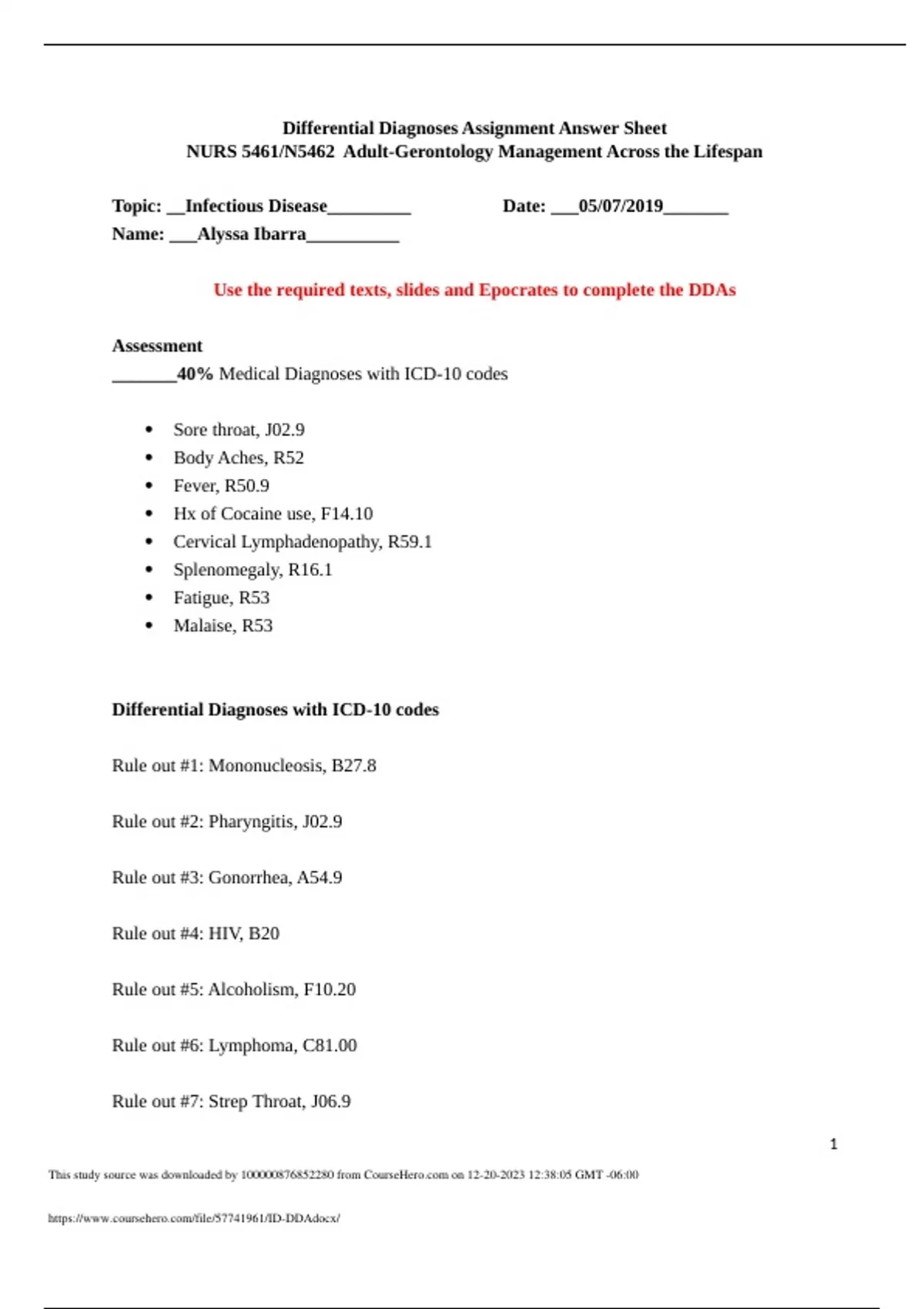 Assessment _______40% Medical Diagnoses with ICD-10 codes Sore throat, J02.9 Body Aches, R52 Fever, R50.9 Hx of Cocaine use, F14.10 Cervical Lymphadenopathy, R59.1 Splenomegaly, R16.1 Fatigue, R53 Malaise, R53 Differential Diagnoses with ICD-10 codes Rule out #1: Mononucleosis, B27.8 Rule out #2: Pharyngitis, J02.9 Rule out #3: Gonorrhea, A54.9 Rule out #4: HIV, B20 Rule out #5: Alcoholism, F10.20 Rule out #6: Lymphoma, C81.00 Rule out #7: Strep Throat, J06