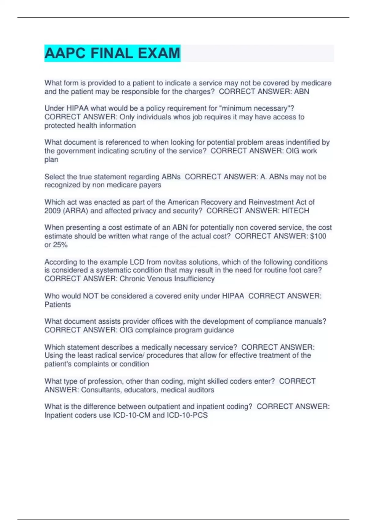 AAPC FINAL EXAM What form is provided to a patient to indicate a service may not be covered by medicare and the patient may be responsible for the charges? CORRECT ANSWER: ABN Under HIPAA what would be a policy requirement for "minimum necessary"? CORRECT ANSWER: Only individuals whos job requires it may have access to protected health information What document is referenced to when looking for potential problem areas indentified by the government indicating scrutiny of the service? CORRECT ANSWER: OIG work plan Select the true statement regarding ABNs CORRECT ANSWER: A. ABNs may not be recognized by non medicare payers Which act was enacted as part of the American Recovery and Reinvestment Act of 2009 (ARRA) and affected privacy and security? CORRECT ANSWER: HITECH When presenting a cost estimate of an ABN for potentially non covered service, the cost estimate should be written what range of the actual cost? CORRECT ANSWER: $100 or 25% According to the example LCD from novitas solutions, which of the following conditions is considered a systematic condition that may result in the need for routine foot care? CORRECT ANSWER: Chronic Venous Insufficiency Who would NOT be considered a covered enity under HIPAA CORRECT ANSWER: Patients What document assists provider offices with the development of compliance manuals? CORRECT ANSWER: OIG complaince program guidance Which statement describes a medically necessary service? CORRECT ANSWER: Using the least radical service/ procedures that allow for effective treatment of the patient's complaints or condition What type of profession, other than coding, might skilled coders enter? CORRECT ANSWER: Consultants, educators, medical auditors What is the difference between outpatient and inpatient coding? CORRECT ANSWER: Inpatient coders use ICD-10-CM and ICD-10-PCS What is a mid level provider? CORRECT ANSWER: mid-level providers include physician assistants (PA) and nurse practitioners (NP) What one is the difference parts of medicare? CORRECT ANSWER: Part A,B,C,D Evaluation and Management (E/M) services are often provided and documented in a standard format. One such as SOAP notes. What does SOAP represent? CORRECT ANSWER: Subjective, Objective, Assessment, Plan What are five tips for coding operative (OP) reports CORRECT ANSWER: diagnosis code reporting, Start with the procedures listed, Look for key words, highlight unfamiliar words, read the body What is medical necessity? CORRECT ANSWER: Relates to whether a procedure or service is considered appropriate in a given circumstance. What is NOT a common reason medicare may deny a procedure or service? CORRECT ANSWER: covered service Under the Privacy rulem the minimum necessary standard does not apply to what type of disclosures? CORRECT ANSWER: Disclosures to the individual who is the subject of the information Which is NOT one of the seven key components of internal complaince plan? CORRECT ANSWER: Conduct training but not perform education on practice standards and procedures ABN stands for? CORRECT ANSWER: Advance Beneficiary Notice What does the abbreviation MAC stand for? CORRECT ANSWER: Medicare Administration Contractor The OIG recommends that provider practices enforce disciplinary actions through well publicized compliance guidelines to ensure actions that are? CORRECT ANSWER: Consistent and appropriate EHR stands for? CORRECT ANSWER: electronic health record Which of the following is a benefit of electronic transactions? CORRECT ANSWER: Timely submission of claims What year was HITECH enacted as part of the American Recovery and Reinforcment Act CORRECT ANSWER: 2009 When are providers responsible for obtaining on ABN for a service NOT considered medically necessary? CORRECT ANSWER: Prior to providing a service or item to a beneficiary In what year did HIPAA became law? CORRECT ANSWER: 1996 Local coverage determination are administered by whom? CORRECT ANSWER: Each Regional MAC Which of the following choices is NOT a benefit of an active complaince plan? CORRECT ANSWER: Eliminates risk of an audlit LCDs only have jurisdiction in their? CORRECT ANSWER: Region The OIG releases a ? outlining its priorities for the fiscal year ahead and beyond CORRECT ANSWER: Work Plan The AAPC offers 500 local chapters across the country for the purpose of? CORRECT ANSWER: Continuing education and networking The medicare program is made up of several parts. Which part covers provider fees without the use of a private insurer CORRECT ANSWER: Part B What type of provider goes through approximately 26 1/2 months of education after completion of a bachelors degree and is licensed to practice medicine with the oversight of a physician? CORRECT ANSWER: Physician assistant (PA) A covered enity may obtain consent from an individual to use or disclose protected health information to carry out all of the following except for what? CORRECT ANSWER: Research What is PHI CORRECT ANSWER: Protected Health Information When coding an operative report, what action would NOT be recommended? CORRECT ANSWER: Coding from the header without reading the body of the report What does CMS-HCC stand for? CORRECT ANSWER: Centers for Medicare and Medicaid Services - Hierarchal Condition Category What type of health insurance provides coverage for low-income families? CORRECT ANSWER: Medicaid What will the scope of a complaince program depend on? CORRECT ANSWER: The size and recources of the providers practice HIPAA stands for? CORRECT ANSWER: Health Insurance Portability and Accountability Act Which coding manuals do outpatient coders focus on learning? CORRECT ANSWER: CPT, HCPCS Level II, and ICD-10-CM Which option below is NOT covered enity under HIPAA CORRECT ANSWER: Worker's compensation Where is gas exchanged and moved from the respiratory system onto the circulatory system? CORRECT ANSWER: Alveoli and capillaries A cystourethroscopy is examination of what structures? CORRECT ANSWER: bladder and urethra What type of cell is housed by th