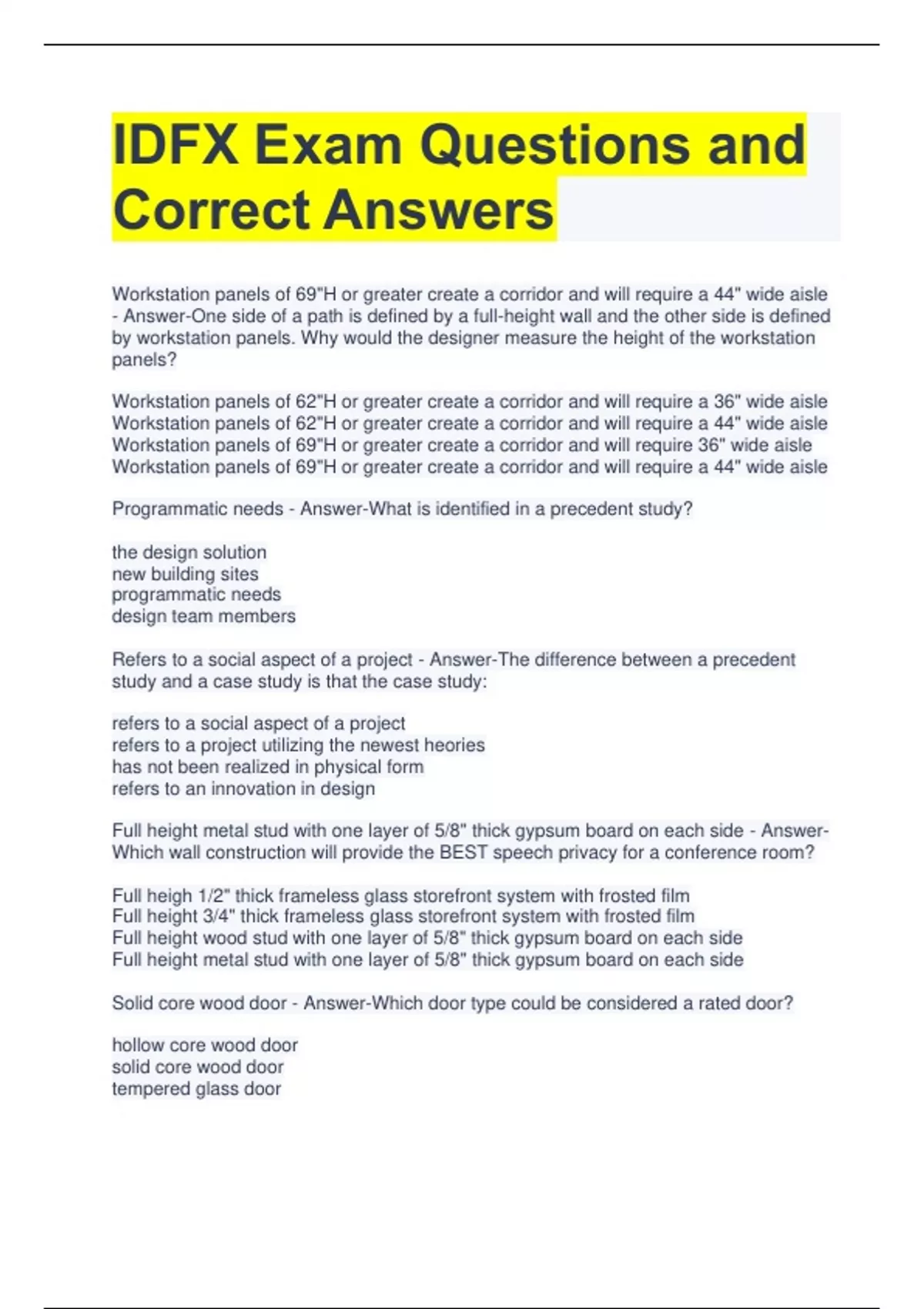 IDFX Exam Questions and Correct Answers Workstation panels of 69"H or greater create a corridor and will require a 44" wide aisle - Answer-One side of a path is defined by a full-height wall and the other side is defined by workstation panels. Why would the designer measure the height of the workstation panels? Workstation panels of 62"H or greater create a corridor and will require a 36" wide aisle Workstation panels of 62"H or greater create a corridor and will require a 44" wide aisle Workstation panels of 69"H or greater create a corridor and will require 36" wide aisle Workstation panels of 69"H or greater create a corridor and will require a 44" wide aisle Programmatic needs - Answer-What is identified in a precedent study? the design solution new building sites programmatic needs design team members Refers to a social aspect of a project - Answer-The difference between a precedent study and a case study is that the case study: refers to a social aspect of a project refers to a project utilizing the newest heories has not been realized in physical form refers to an innovation in design Full height metal stud with one layer of 5/8" thick gypsum board on each side - Answer-Which wall construction will provide the BEST speech privacy for a conference room? Full heigh 1/2" thick frameless glass storefront system with frosted film Full height 3/4" thick frameless glass storefront system with frosted film Full height wood stud with one layer of 5/8" thick gypsum board on each side Full height metal stud with one layer of 5/8" thick gypsum board on each side